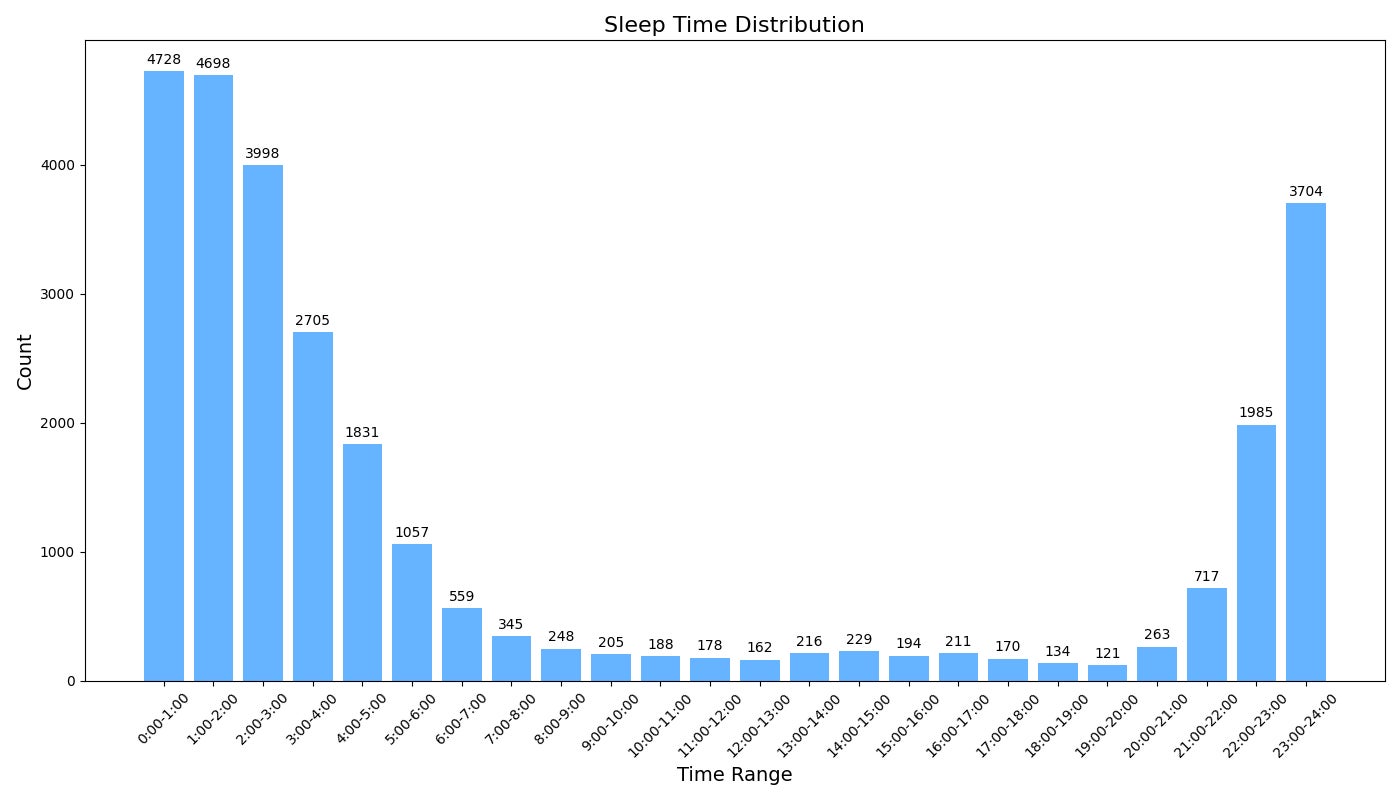 入眠時刻のピークは0時〜2時。全時間帯に入眠が記録される