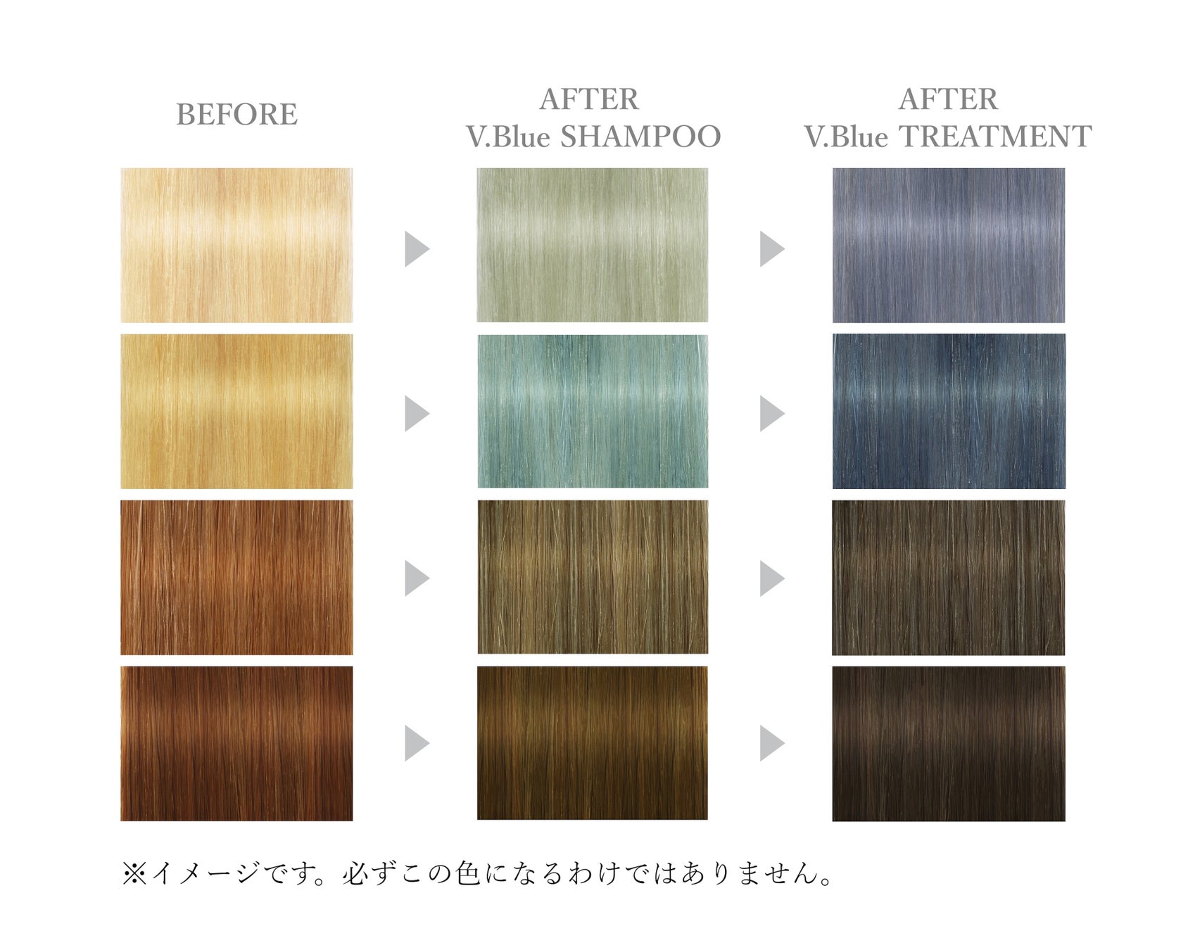 オレンジと黄色の反対色であるバイオレット×ブルーに着目。ハイトーンには青みを足しながら、カラーレベル6~10の方はアッシュ感をキープすることで透明感※を引き出し、理想のカラーを持続可能にします。「&be カラーシャンプー V.Blue」よりもさらに青みが強いため、髪の毛がオレンジになりやすい方におすすめです。