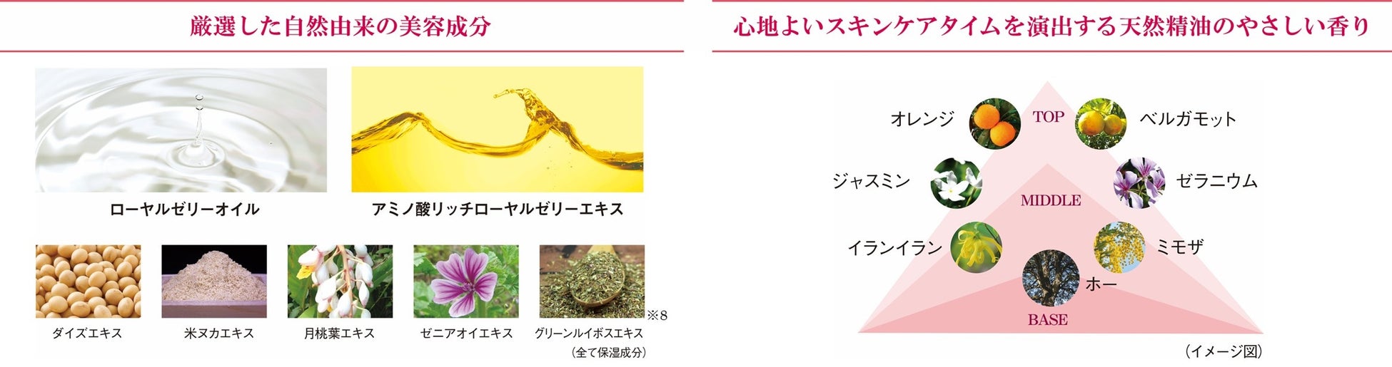 独自開発の保湿成分「デセン酸リッチローヤルゼリーエキス」「アミノ酸リッチローヤルゼリーエキス」を合わせて60%配合※2。まるで美容サプリメントのように保湿成分を肌に届けます※3。