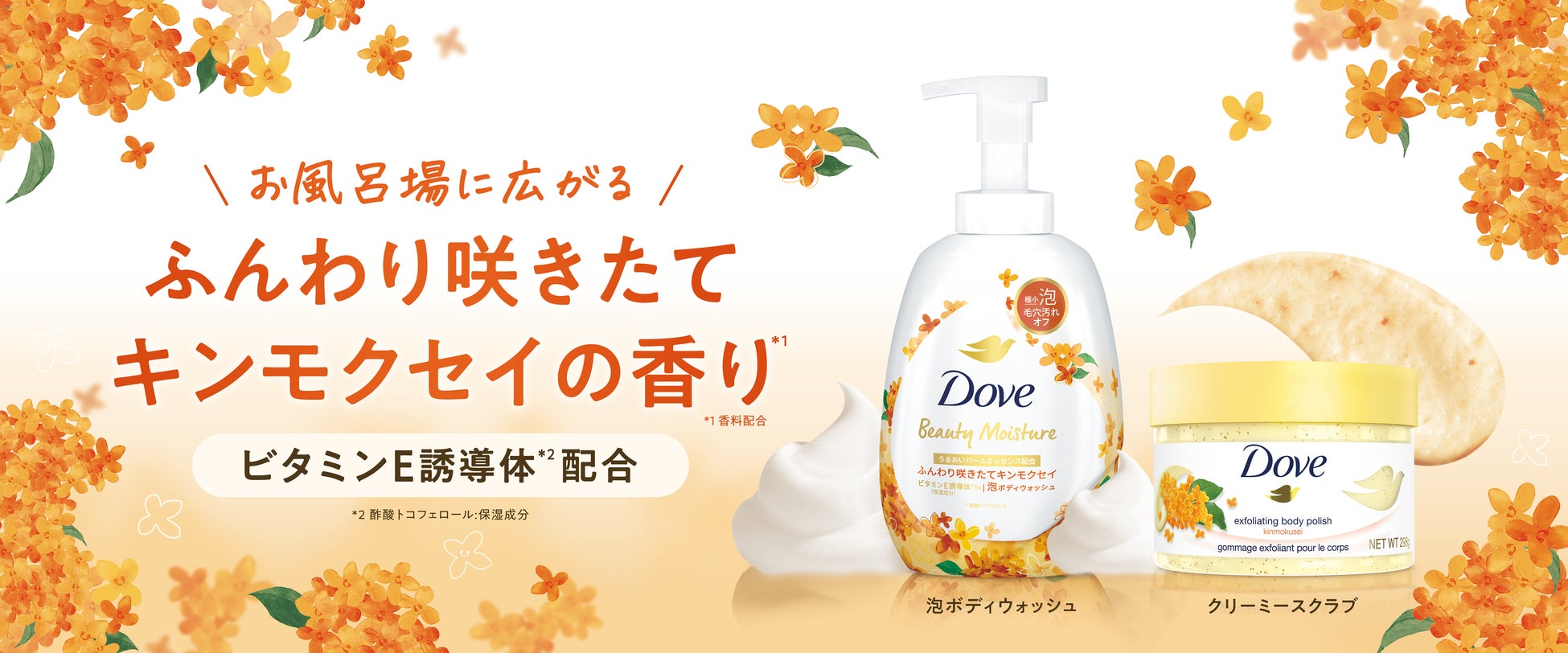 生クリームのような“とろふわ”テクスチャーが人気の「ダヴ クリーミースクラブ」シリーズと、するりとのびる“ひとふで泡” ※2と約500万個の極小泡※3が真珠肌を叶える「ビューティーモイスチャー 泡ボディウォッシュ」シリーズから、秋の訪れを感じるキンモクセイの香りが数量限定で登場。お風呂場に広がる華やかなキンモクセイの香りを身体に纏いながら、心安らぐ癒しのバスタイムをお過ごしください。