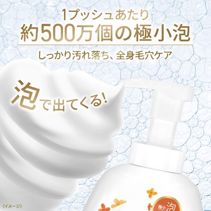 1プッシュで約500万個のへたらない極小泡が全身にするっとひとふで書きのようにのび、毛穴汚れをオフします。さらに、新たにビタミンE誘導体※7を配合。紫外線を浴びて乾燥したお肌をケアし、洗い上がりもつっぱらないうるおう肌へと導きます。かわいいパッケージとキンモクセイの香りのボディウォッシュで、秋の季節を楽しみながら毎日のバスタイムを過ごしてみてください。
