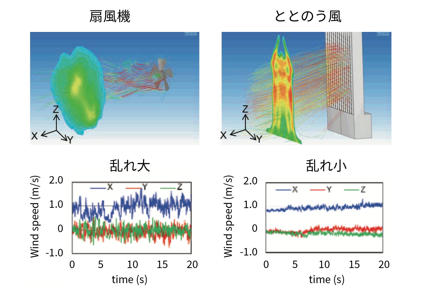 等間隔に設置された柱から気流が吹き出すと、柱と柱の間にある空気が誘因されます。それらが一体となって乱れの少ない、滑らかで幅の広い風が吹いてきます。自然の風の強弱のゆらぎを計測し、ゆらぎを再現することで「ととのう風」を生み出しました。