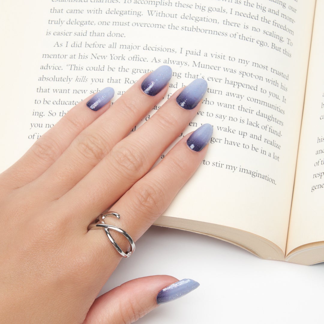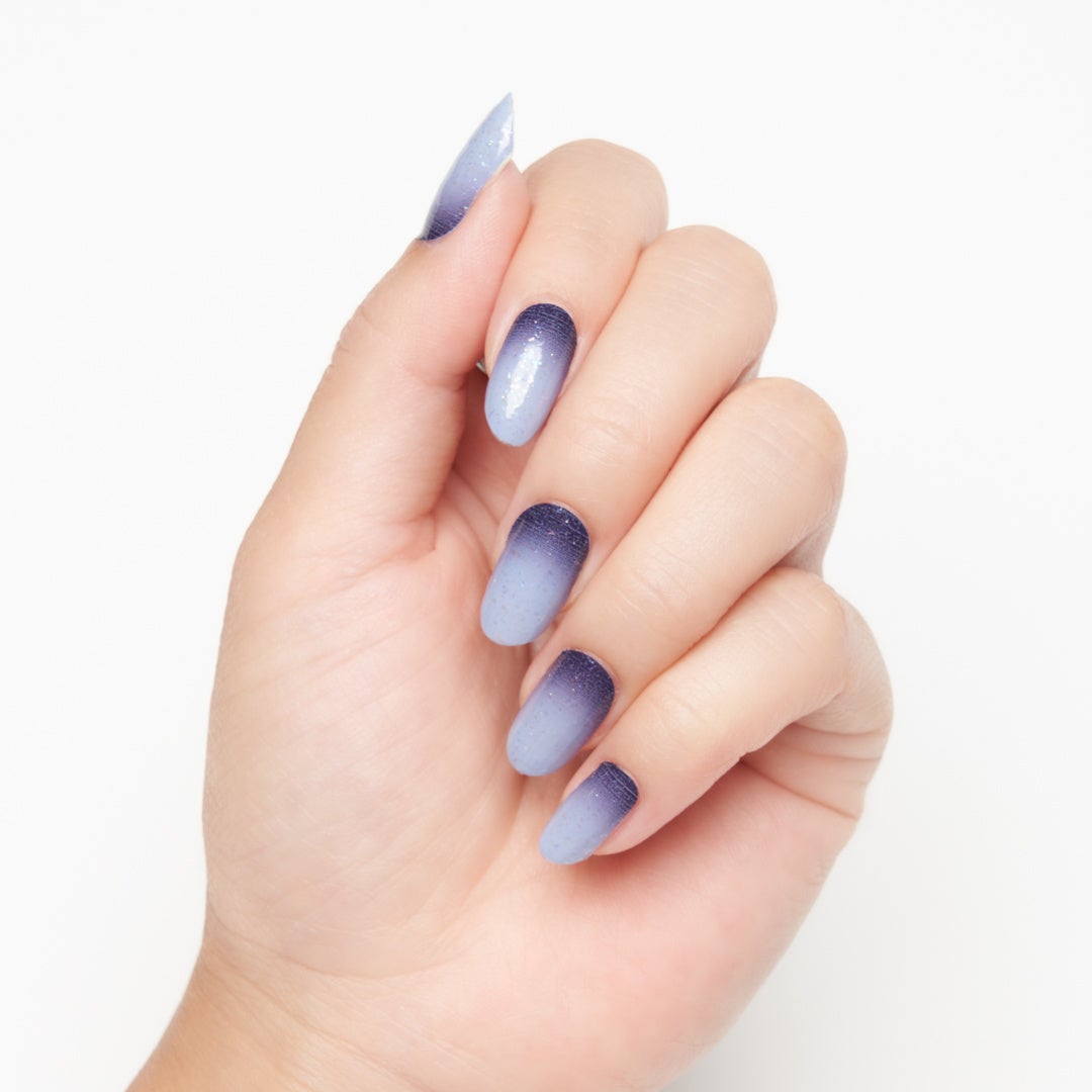 色の変化で幻想的な明け方の空を表現し、全体に乗せたラメでツヤ感をプラスしました。ラメはオーロラカラーのとても細かいホイルタイプ。クールな印象はそのままに、控え目なきらめきも楽しめます。
