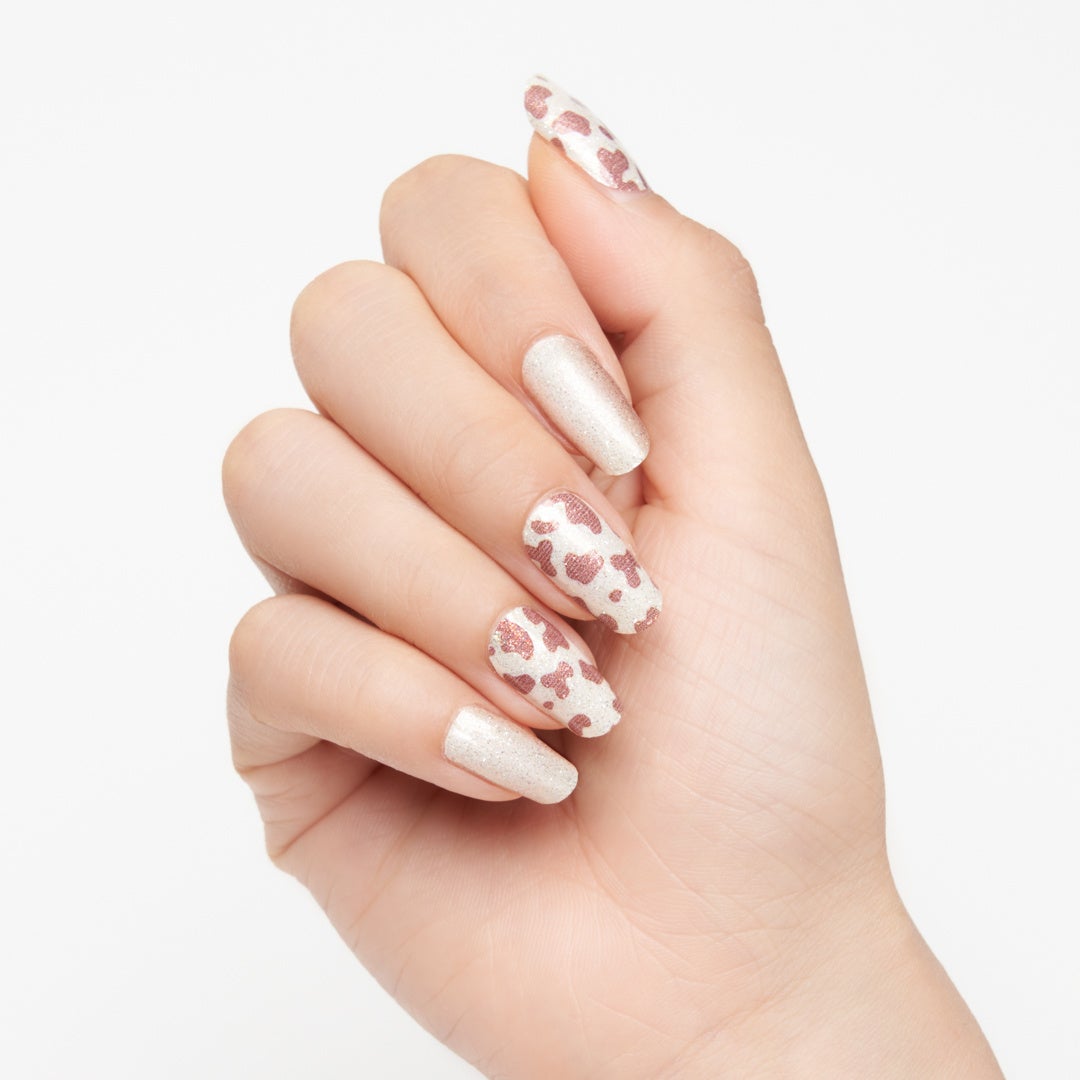 ホワイトグリッターベースに、ブラウンで牛柄を描いたデザインネイル。