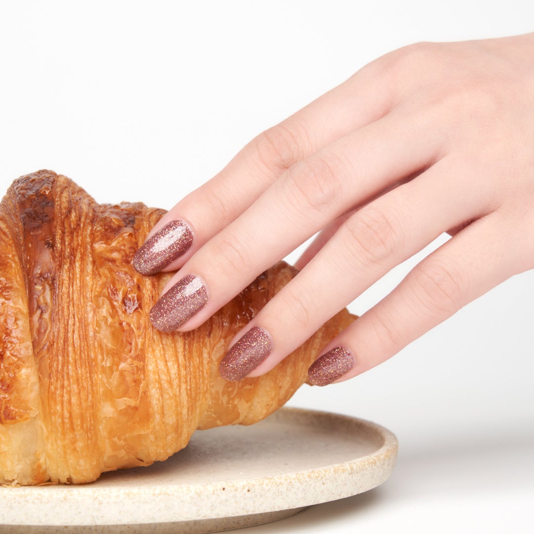 ほんのり赤みのあるコッパ―ブラウンは、肌馴染みが良く指先を美しく見せてくれる色。細やかなマルチカラーラメも混ざり、光の角度で繊細な輝きも。上品さの中に華もある、使い勝手の良いデザインです。