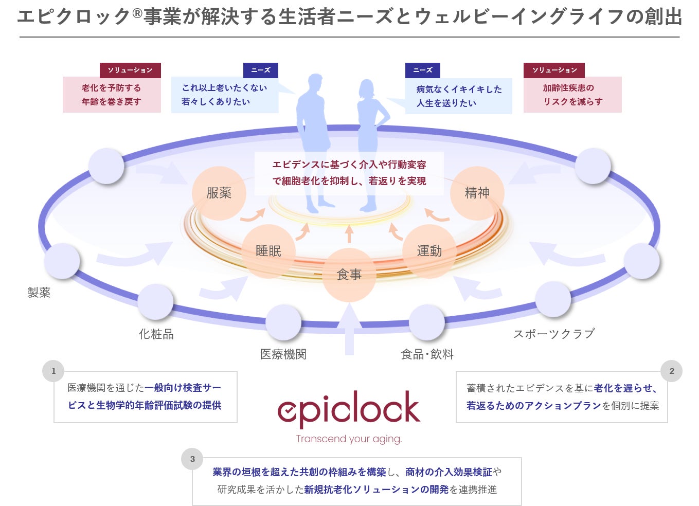 エピクロック®事業は、独自の生物学的年齢評価技術*1を起点として、生活習慣の改善や特定の介入がもたらす抗老化効果を評価する研究支援、企業・研究機関との連携を通じた新規抗老化ソリューションの開発、身体老化度の評価結果と抗老化*2に向けたアクションプランを提供する一般向け検査サービスなど、を行う事業です。