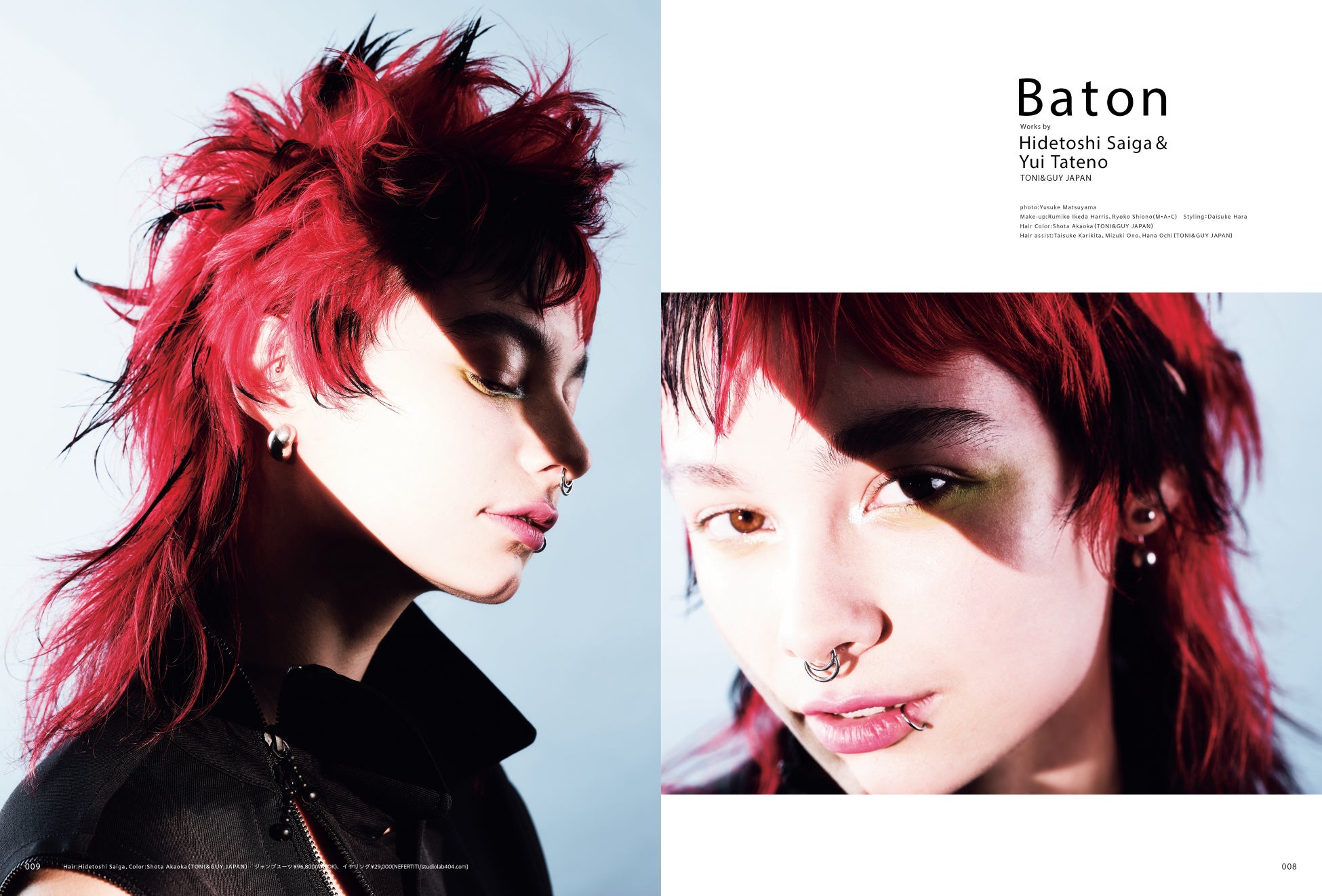 表紙と巻頭特集「Baton」では『トニーアンドガイジャパン』代表の雑賀英敏さんと、『トニーアンドガイロンドン』で腕を磨く舘野唯さんが、ダイナミックなルックを展開。二代目社長としてサロンを牽引してきた雑賀さんと、「次期社長になる!」と自ら宣言してロンドンへ修行に旅立った舘野さんの初めての作品による競演&サロンの未来についてのインタビューは必見、必読です!