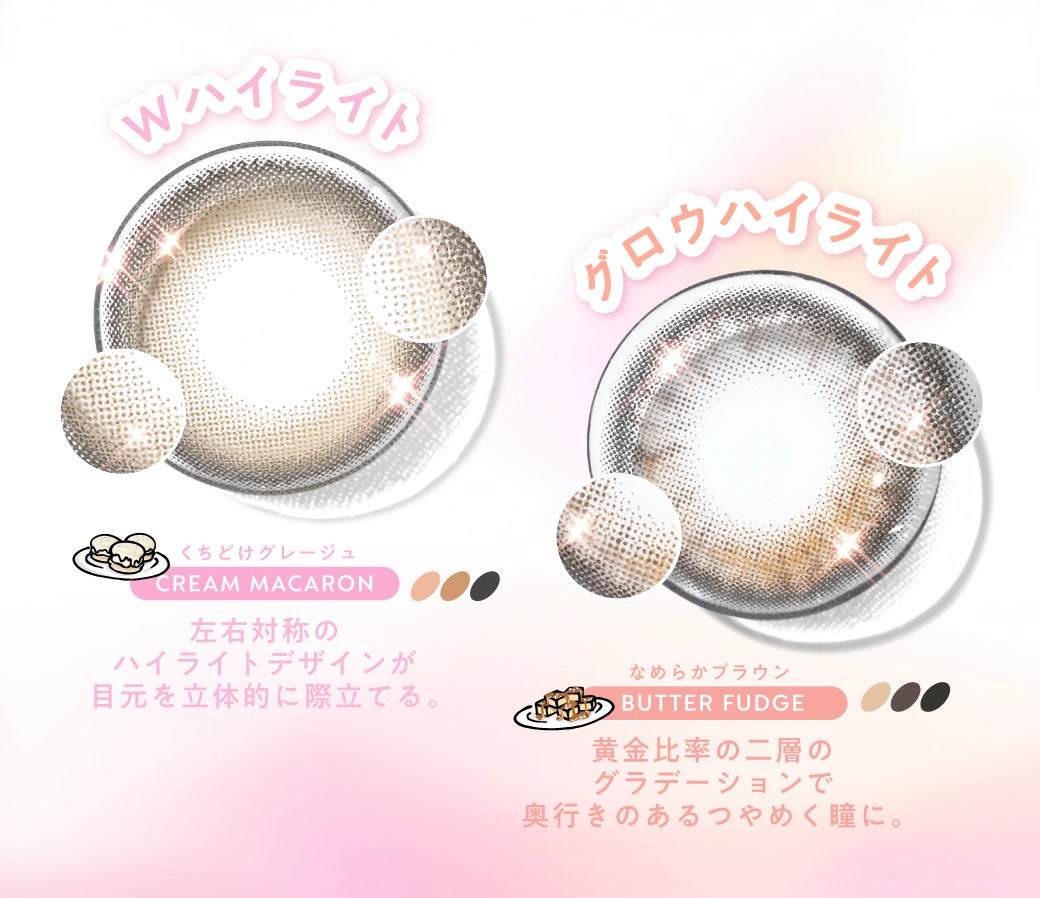 瞳に立体感とツヤを演出させる2つの『贅沢ハイライト』デザインを採用。