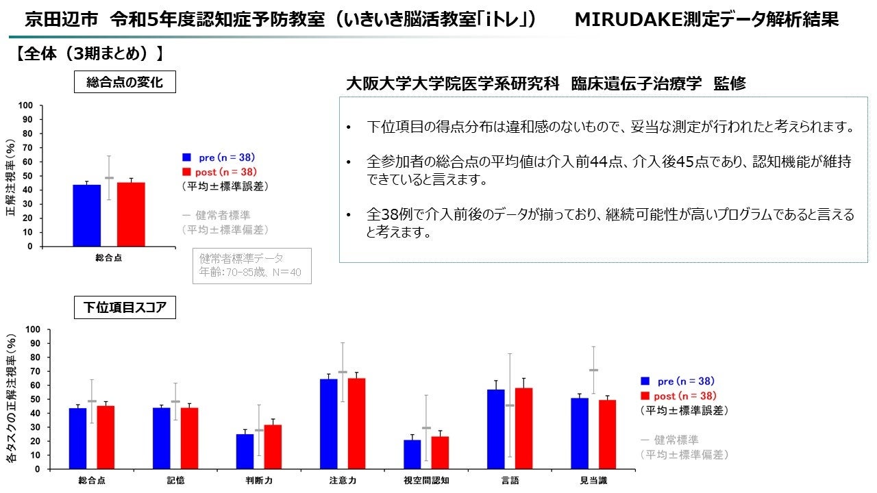 (1)京都府京田辺市での認知症予防教室参加者(38名)の認知スコアが上昇