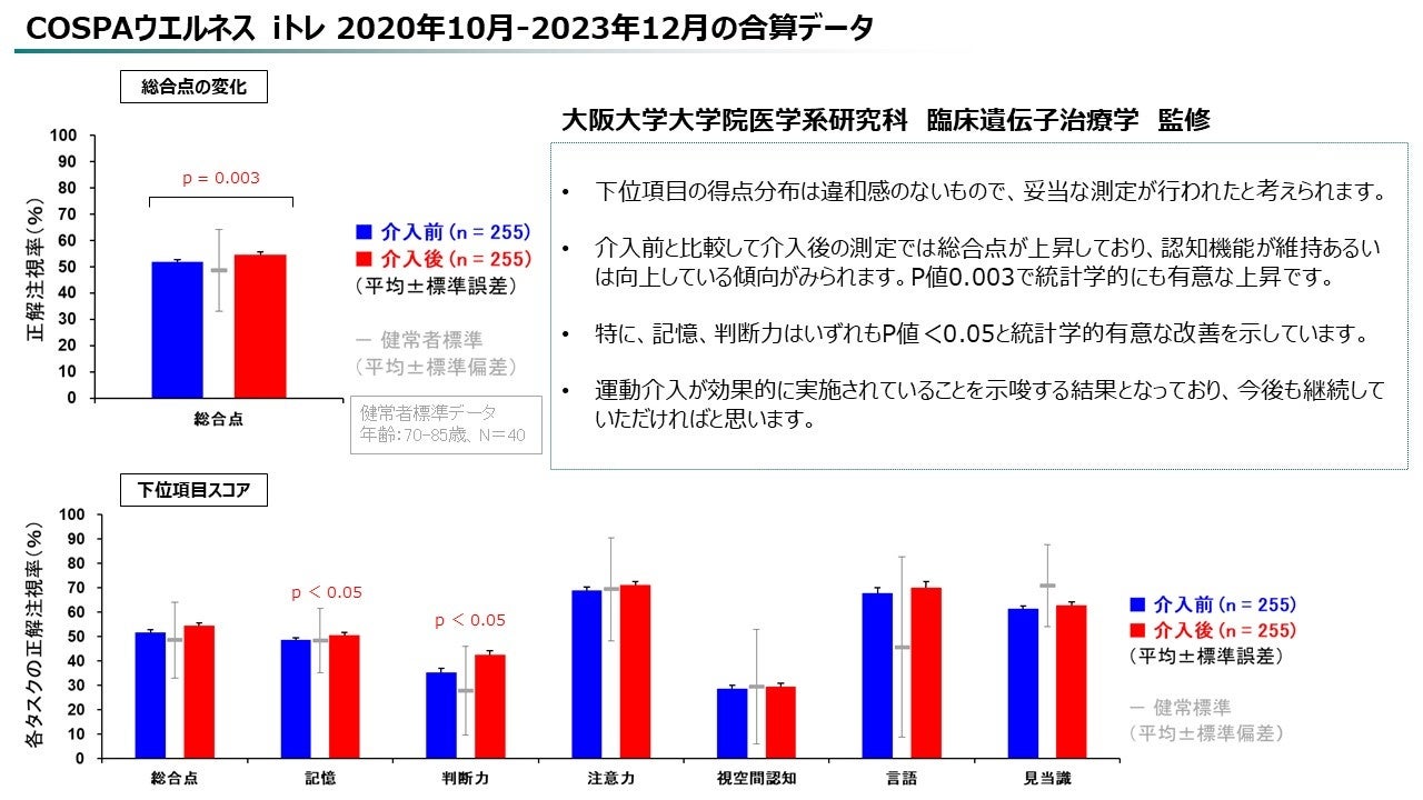 「コ・ス・パ」のブランド名で、フィットネスクラブ・テニスクラブ・キッズスイミングスクールの運営するほか、24時間営業フィットネスジム「FITBASE24」、⾼地トレーニングスタジオ「30peak」、公共スポーツ施設の受託運営など、関⻄圏を中⼼に計64店舗を展開する株式会社COSPAウエルネス(本社:⼤阪市中央区、代表取締役:⼤友 康彰 )は、脳活性化プログラム「iトレ」を、2021年より当社運営施設への導⼊や関⻄圏の⾃治体へ介護予防事業として展開しています。今回、自治体介護予防事業および自主事業における解析データにてプログラムの参加前後で認知機能スコアが上昇した結果をお知らせします。