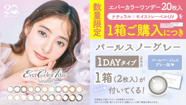 キャンペーン期間中、エバーカラーワンデーナチュラル/エバーカラーワンデーナチュラルモイストレーベルUVを1箱ご購入いただくと、「パールスノーグレー」の1dayタイプ(非売品)を1箱(2枚入)お渡しいたします。