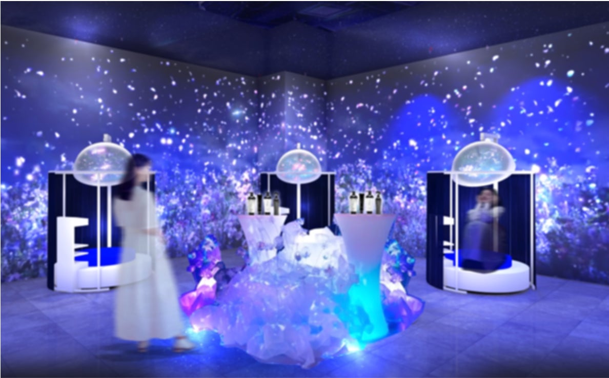 夜空の中でキラキラと輝く花々の中で新ラインTHERATIS TERAの特徴であるアイテム毎に異なる香りをご体感いただけるブースです。パーソナルスペースで香りに包まれながらリラックスしていただけます。