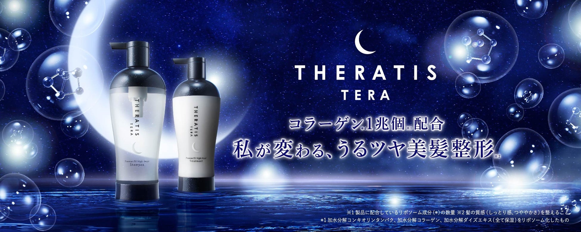 「THERATIS TERA」は、夜寝ている間に1兆個※1のブラックコラーゲン*1が髪に浸透し、毛髪全般の悩み(地肌ケア・パサつき・うねり・枝毛)にアプローチする新シリーズです。ブラックパールエキス*2、ナノコラーゲン*3、ブラックソイエキス*4をはじめ、90%以上美容液成分を配合※3しています。シャンプー、ヘアパック、ヘアトリートメントに加え、「ブースター ナイト ミスト」も新アイテムとして発売しています。