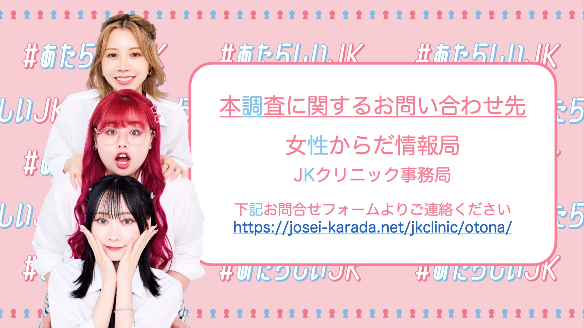 JKクリニックは、女性からだ推進大使「くれいじーまぐねっと」の若年女性のヘルスケア啓発活動の2年目のプロジェクトとして、2024年8月30日に発表された思春期女性の婦人科受診支援活動です。「#あたらしいJK」をキーワードに、