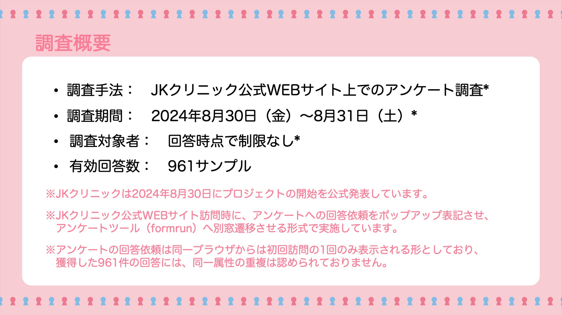 このアンケートの回答数は9月1日(日)時点で1,000名を突破。そこで、JKクリニックのプロジェクト開始時点のベンチマークとして、8月31日までに回答のあった961サンプルについて集計を行い、速報としてその結果をレポート形式で公開いたします。