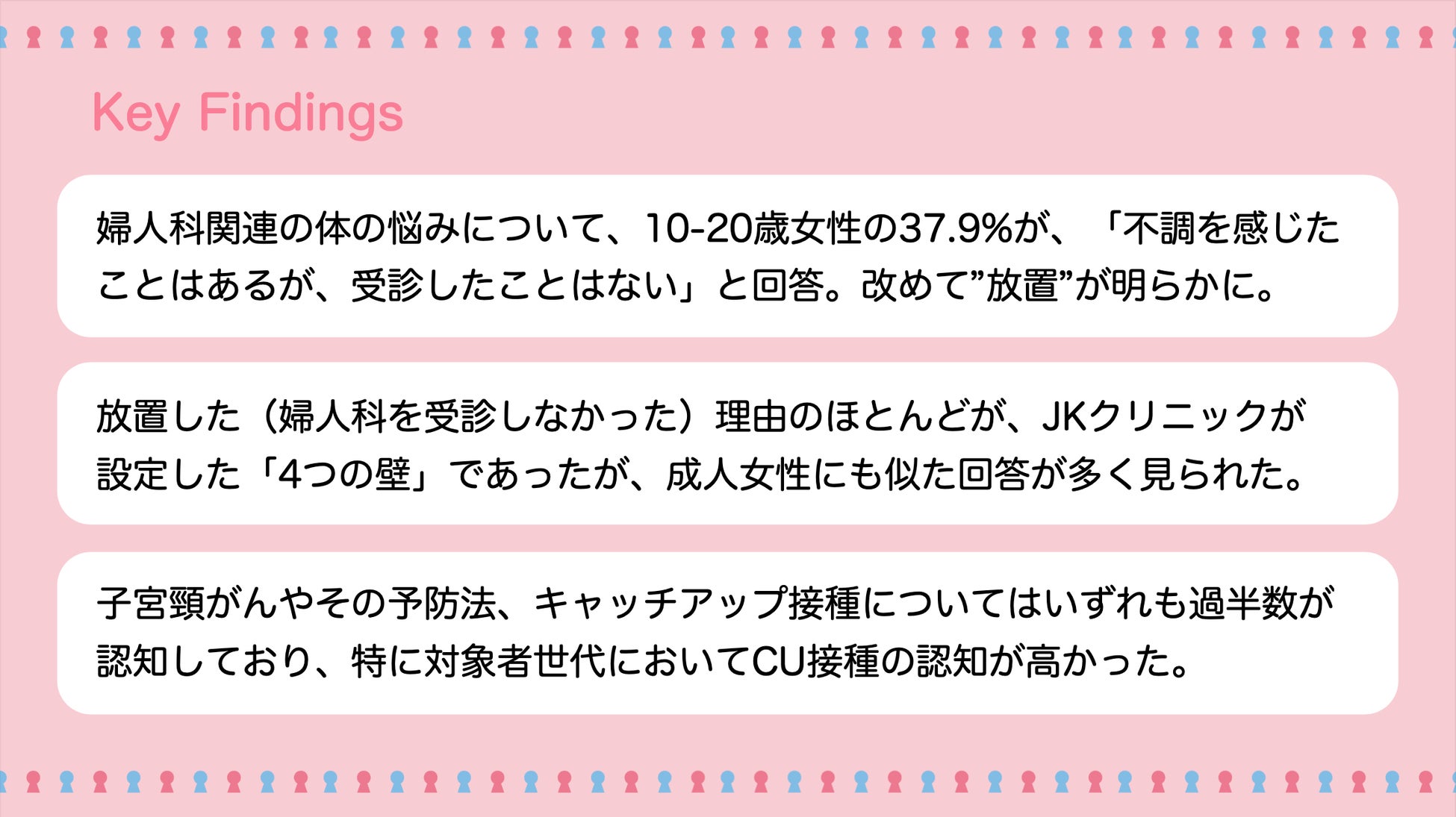 これらお寄せいただいたメッセージや、ご協力いただいたアンケートにより改めて浮き彫りになった課題を踏まえ、1人でも多くの思春期女性の健康から、より良い社会へと貢献すべく、私たちは「JKクリニック」のプロジェクトを推進してまいります。
