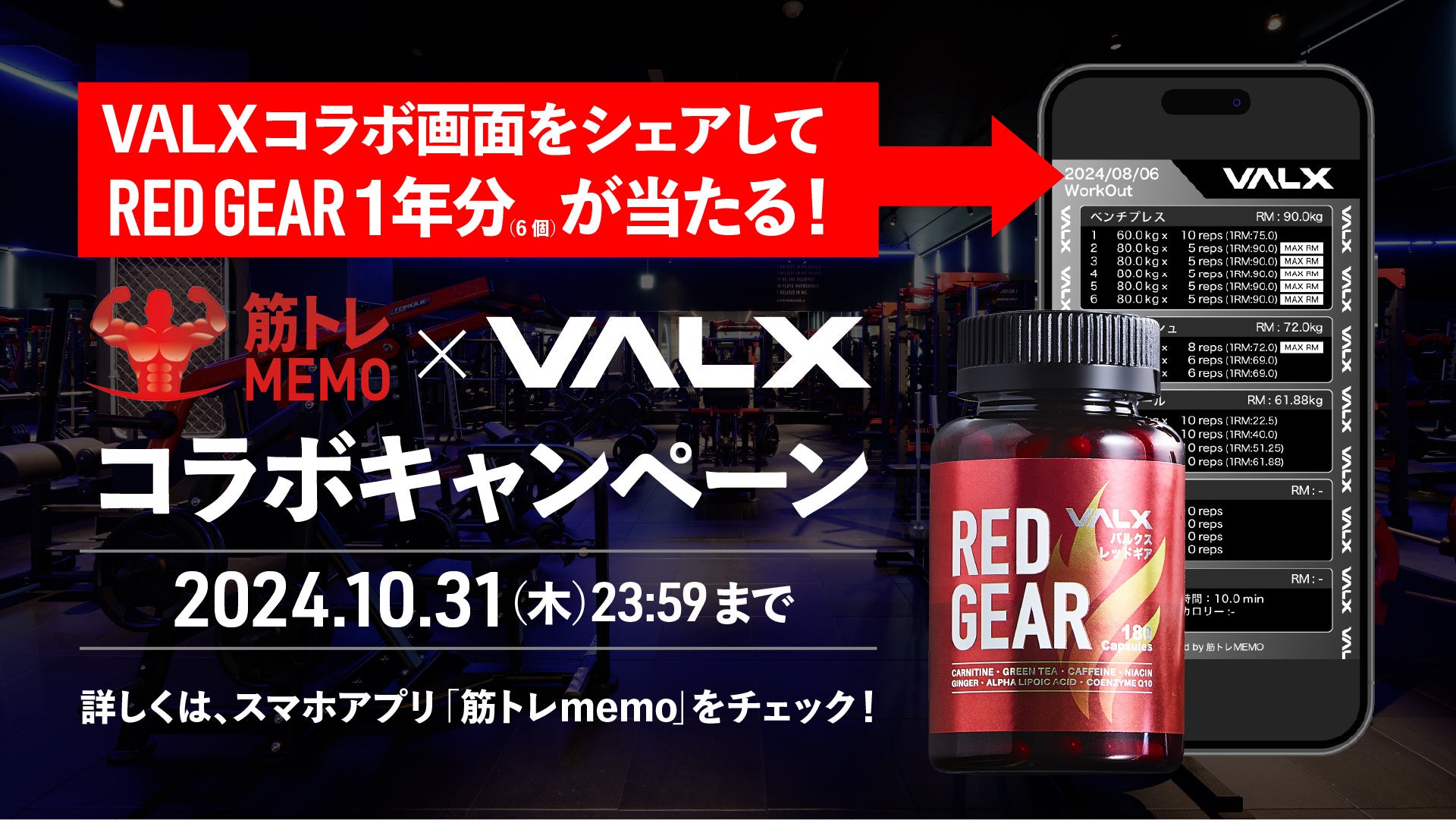 トレーニー御用達の筋トレ記録アプリ「筋トレMEMO」とフィットネスブランド「VALX」が2024年10月16日(水)から1年分のRED GEARが当たるコラボキャンペーンを実施