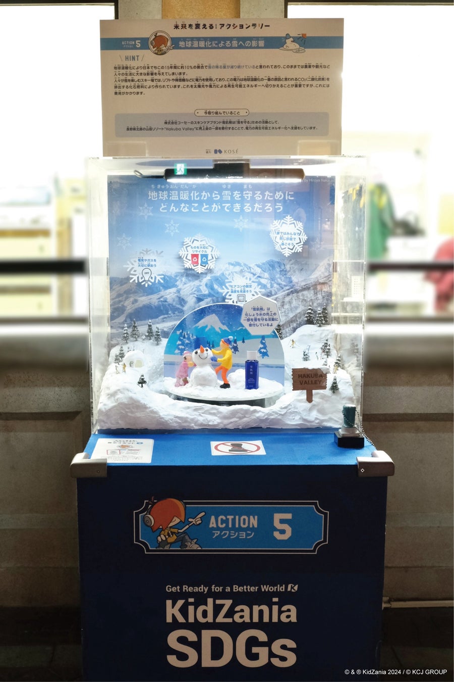 今年は “雪を守る”ことの必要性を次世代にも伝えていくため、当社が2022年より「ビューティスタジオ」パビリオンを出展(※1)している「キッザニア東京」で開催中の「未来を変える!アクションラリー(※2)」に参画(※3)しています。未来を担う子どもたちに「雪肌精 SAVE the BLUE~Snow Project~」の活動について伝え、“雪を守る”ことの重要性について楽しく学び、考える機会を提供しています。