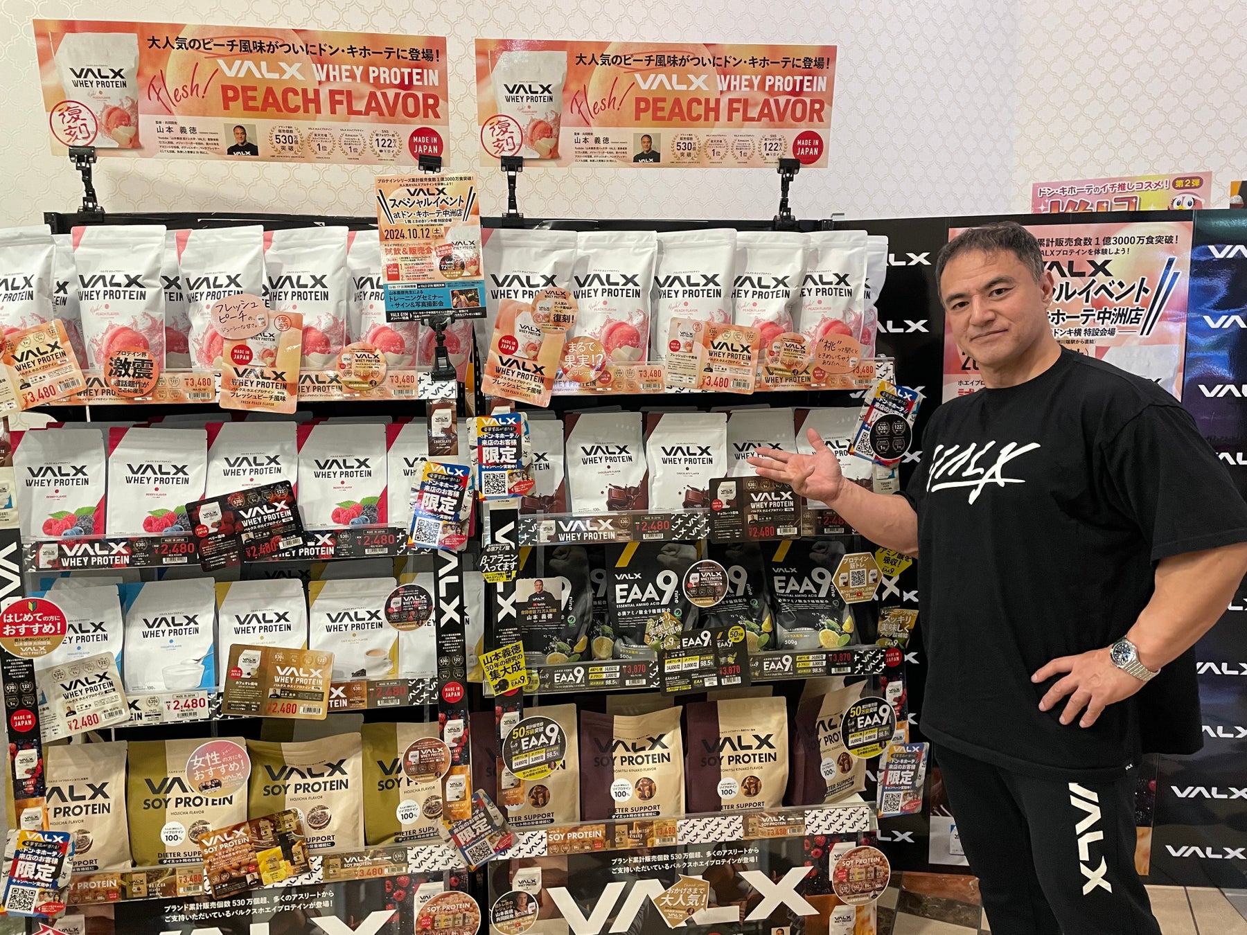 フィットネスブランド「VALX(バルクス)」を展開する株式会社レバレッジ(本社:東京都渋谷区、代表取締役:只石昌幸、以下レバレッジ)は、2024年10月12日(土)にドン・キホーテ中洲店、VALX GYM福岡天神にて2024年10月3日(木)より全国のドン・キホーテ系列店(※)にて発売開始になったフレッシュピーチ風味のプロテインを含む4フレーバーの試飲会や、山本義徳氏によるサイン&写真撮影会、トレーニングセミナーを開催しましたので、その様子をご報告いたします。