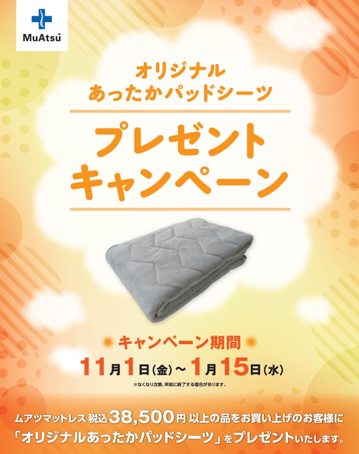 皆様の睡眠をより豊かにするため、昭和西川株式会社(東京都中央区、代表:西川惠)は、MuAtsuを中心にしたさまざまな寝具をご提案しています。今回は寒さが本格化するシーズンを迎えるにあたり、ムアツ マットレス税込38,500円以上をお買い求めいただいたお客様に “オリジナルあったかパッドシーツ”をお贈りするキャンペーンをスタートいたします。