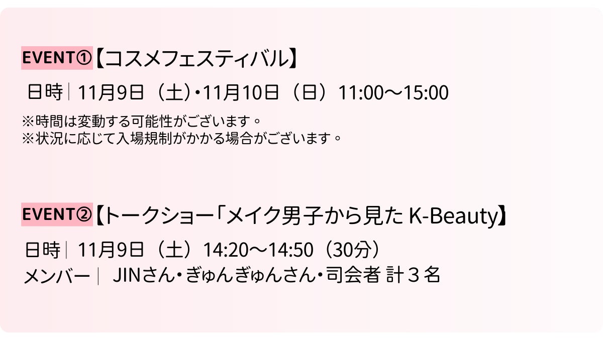 学園祭内では、コスメフェスティバルだけでなくK-Beautyに関したトークショーも開催されます。 「メイク男子から見た K-Beauty」というトークテーマのもと、Youtuber “JIN”さんと 「nuse(ヌーズ)」アンバサダー
