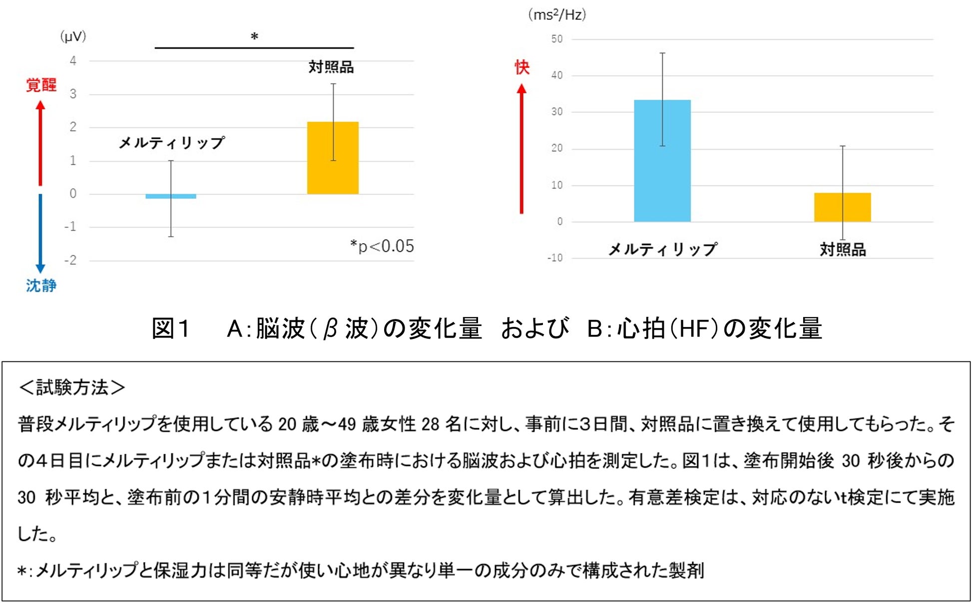 当社の先行研究※3において、脳波、心拍、脳血流などの生理指標を測定することで、お客様が潜在的に感じている製品の使い心地に対する「好み」を評価できる可能性を見出してきました。今回、メルティリップを普段愛用されている方が、メルティリップまたは使い心地が異なる対照品を唇に塗布している最中の脳波および心拍を測定しました。その結果、メルティリップ愛用者がメルティリップを塗ると脳波(β波)は低下し、使い心地が異なる対照品を塗ると上昇傾向を示しました(図1A)。一方、心拍のうち、副交感神経の状態を示すHFはどちらも上昇傾向を示しました(図1B)。
