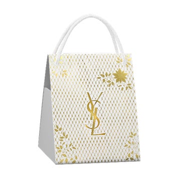 ゴールドのレースと、ムッシュ イヴ・サンローランが愛したエーデルワイスの花をモチーフにしたデザイン。ホリデー限定のホワイト×ゴールドのリボンや、リップバッグから、ギフトバッグまで。