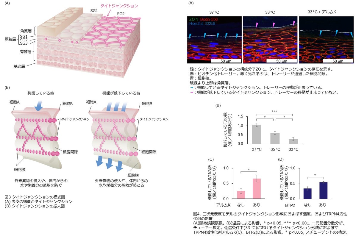 温泉やスパ、マッサージなど、肌を温める温熱スキンケアは肌に良いことが知られていますが、そのメカニズムは明らかになっていません。これまで、温泉成分として知られるアルムKが、細胞の感覚センサーTRP(トリップ)チャネル※1の一種であり、温かい温度を感知するTRPM4を活性化することや、ヒト表皮角化細胞からの炎症シグナルを抑制すること(2019年5月28日リリース)、および表皮角化細胞の増殖を促進すること(2023年11月30日リリース)を見出し、アルムKがTRPM4を活性化することにより肌状態を改善することを明らかにしてきました。しかしながらアルムKによる肌のバリア機能への影響については分かっていませんでした。