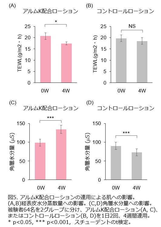 アルムKを配合したローションを1日2回、4週間連用したグループでは、バリア機能の指標であるTEWL値が低下したことから(図5A)、バリア機能が改善することが明らかになりました。一方で、コントロールローションを使用したグループではTEWL値に変化は認められませんでした(図5B)。また、アルムKを配合したローションにおける過去の試験で、角層水分量が上昇することは分かっており(国際化粧品技術者会連盟ミラノ中間大会2019にて発表)、今回の試験でも同様の結果が得られました(図5C)。一方、コントロールローションを使用したグループでは、角層水分量は低下しました(図5D)。これは、試験を実施した時期が冬季であったためと考えられます。よって、低温度環境下や乾燥環境下であっても、アルムKを配合したローションを使用することで、肌の状態は改善されると考えられます。