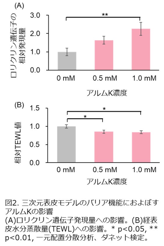 今回、3次元表皮モデルにTRPM4活性化剤であるアルムKを添加して培養すると、表皮角化細胞におけるロリクリン遺伝子の発現量が増加することが明らかになりました(図2A)。また、このときに経表皮水分蒸散量(TEWL)が低下することも明らかになりました(図2B)。これらの結果は、アルムKが表皮角化細胞の角化を促進し、皮膚のバリア機能を強化したことを示しています。