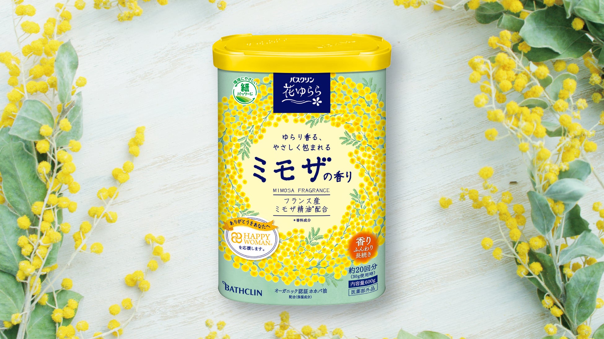株式会社バスクリン(本社:東京都千代田区 社長:三枚堂正悟)は、フランス産のミモザ精油(香料成分)をブレンドし、黄色くふわふわとした可憐(かれん)な花からあふれる春の心地よさを色と香りで表現した「バスクリン 花ゆらら ミモザの香り」を12月2日(月曜日)に数量限定で発売いたします。ミモザがシンボルフラワーの3月8日「国際女性デー(ミモザの日)」に向けて、一足早く春を感じるミモザの香りをお楽しみください。