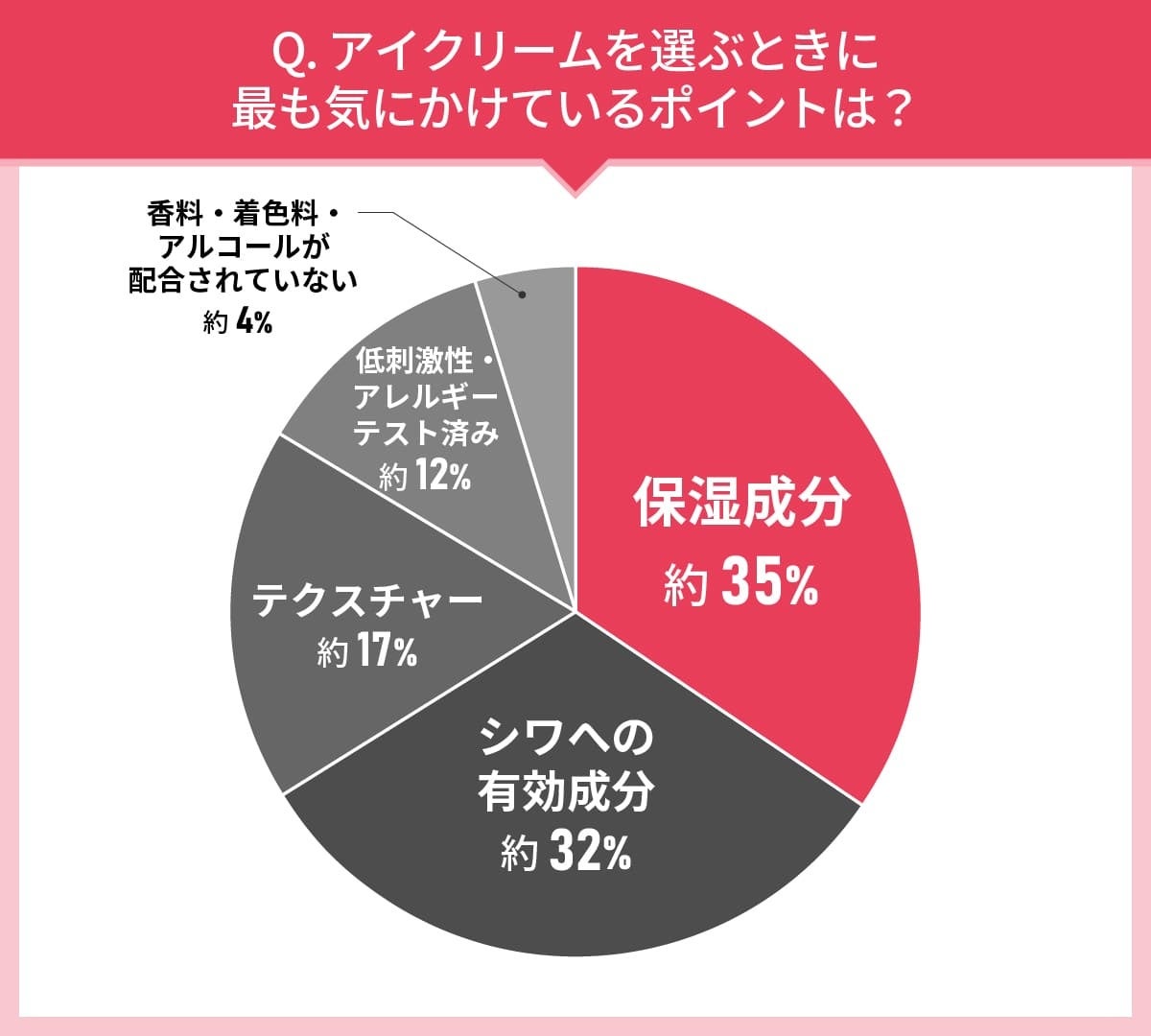 最も多かったのが「保湿成分」の約35%でした。次いで「シワへの有効成分」が約32%と、同等の結果に。目元の乾燥やシワに悩んでいる人が多いことがうかがえます。また、目元は敏感な部位なので、「低刺激性・アレルギーテスト済み」「香料・着色料・アルコールが配合されていない」等、刺激が少ない成分配合や、テクスチャーも重視してアイクリームが選ばれている印象でした。