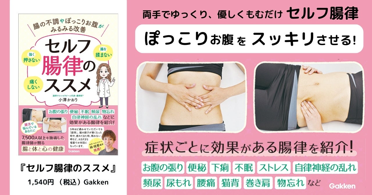 「腸活」がうまくいかない二大原因は「腸の動きの悪さ」と「ぽっこりお腹」だった! 両手で優しくもむだけの【セルフ腸律】で腸の動きと流れを整え、体のゆがみや痛みを改善。心と体をサポートします。