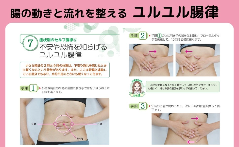 まずは、両手で優しくほぐす「ユルユル腸律」で、腸の動きと流れを整えます。
