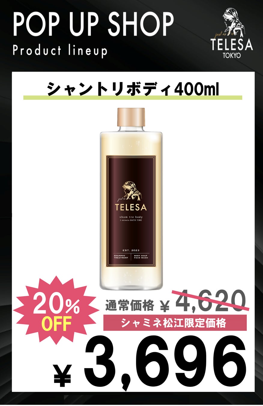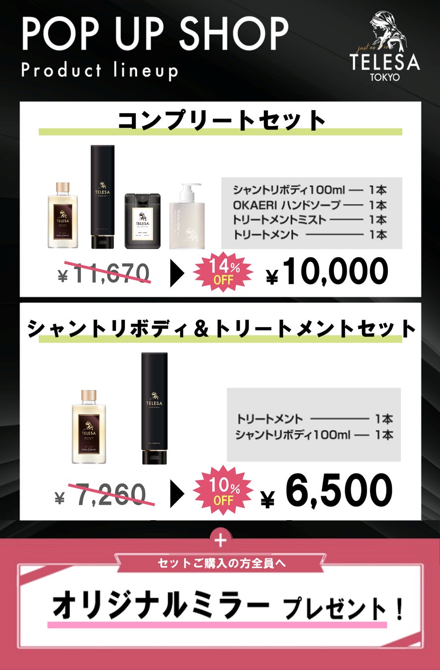 今回のポップアップでは、TELESA全商品を店頭にてお得にご購入いただけるほか、ポップアップ限定の割引セット商品やシャントリボディ400mlを20%OFFでご購入いただけます。