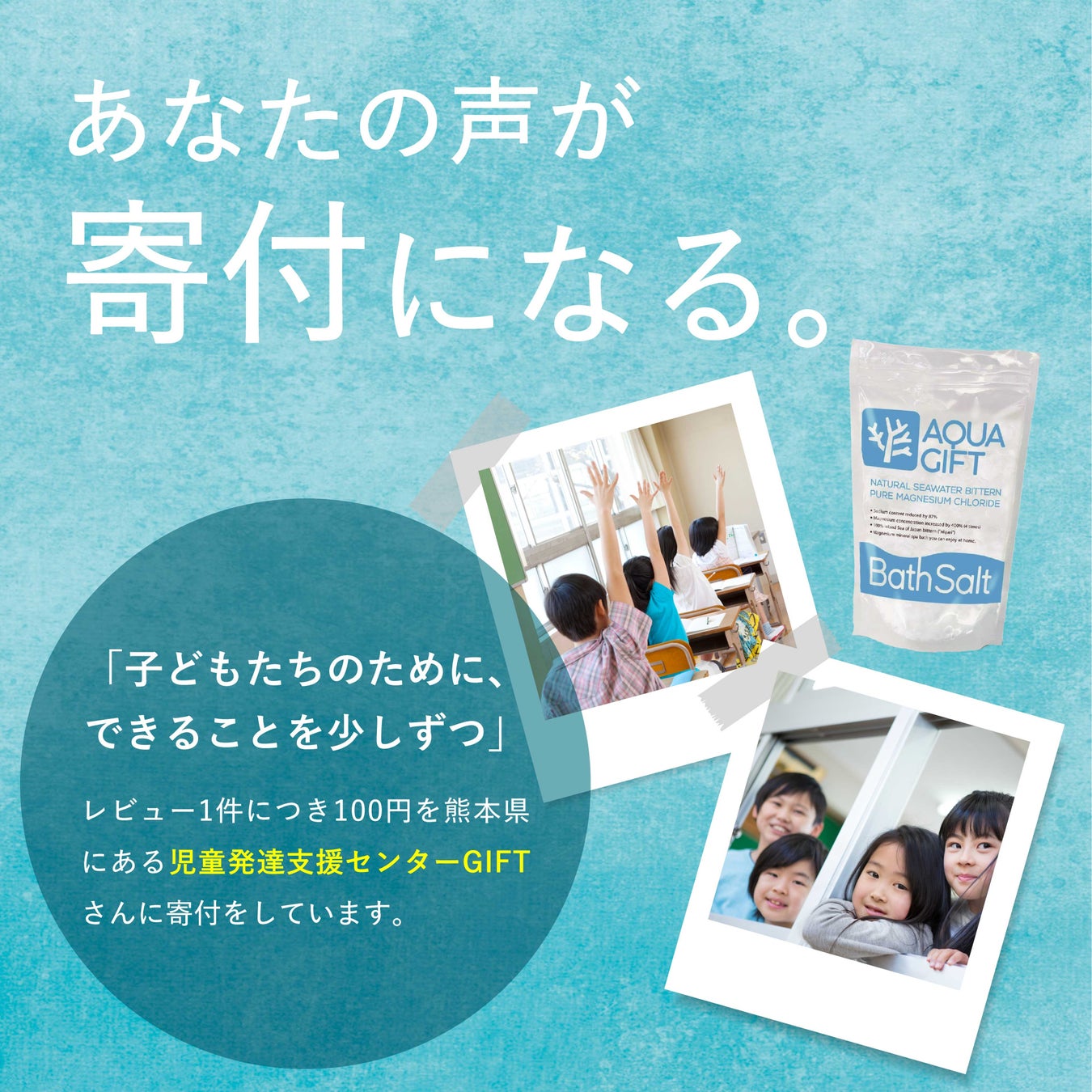 弊社商品AQUAGIFTに頂いた1レビューにつき100円を、児童発達支援センターGIFTに寄付させていただき共に未来を担う子どもたちの成長をサポートします。