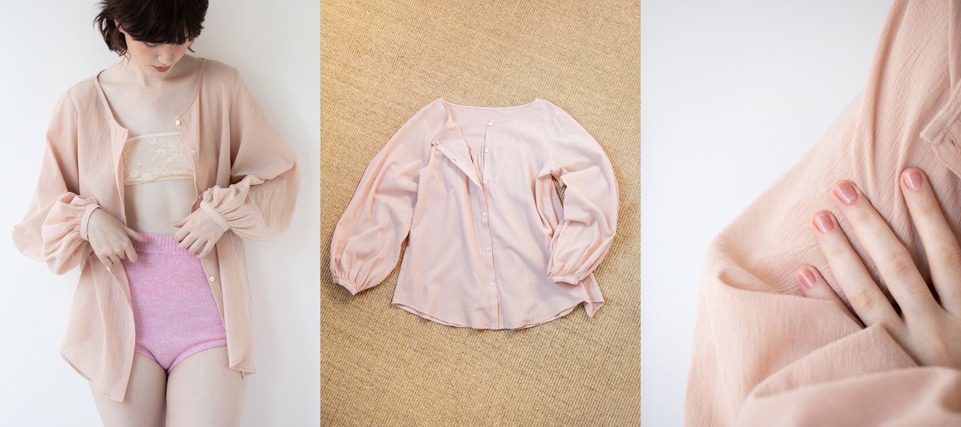 ガーゼ風の生地にシボ加工を施し、ふんわりと軽やかな着心地に仕上げたシアーブラウス。ガーゼ特有の涼しげな透け感があり、暑い季節にも快適に着られるアイテムです。ふわっとボリュームのある袖がコーディネートのアクセントになり、シンプルなスタイリングにも洗練された表情をプラス。フロントボタンを少し開けて鎖骨を美しく見せたり、全開にして羽織としても着られるなど、さまざまなアレンジが楽しめます。インでもアウトでもバランスよく決まり、程よい抜け感を演出。大人っぽくクールな雰囲気で着ていただける一枚です。