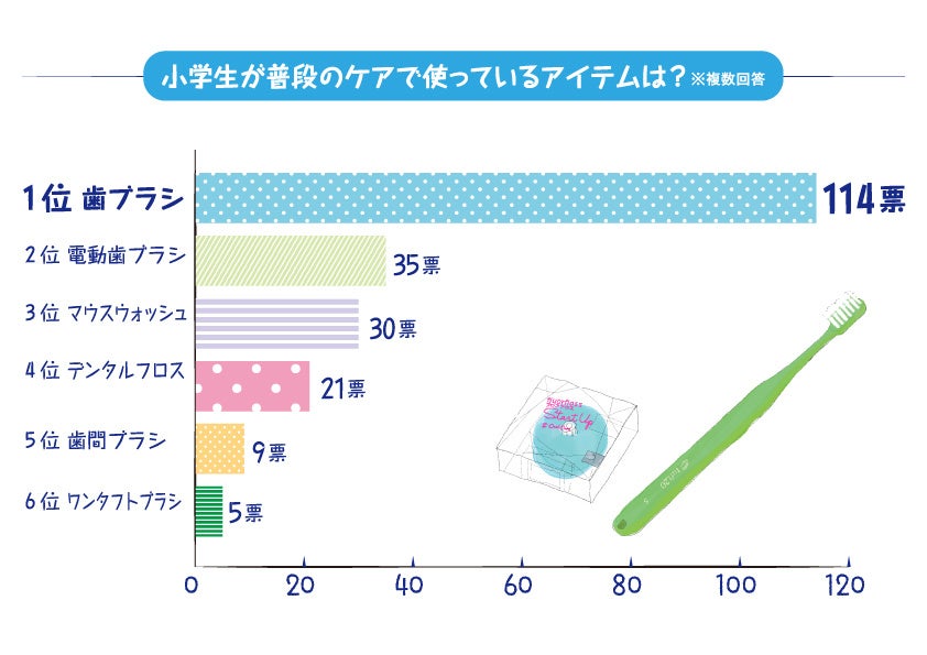 一番使われているアイテムは、やはり王道の歯ブラシ。予防意識が高まっていることもあり、歯ブラシとあわせてマウスウォッシュや歯間ブラシ、ワンタフトブラシなどを使っている人もいました。