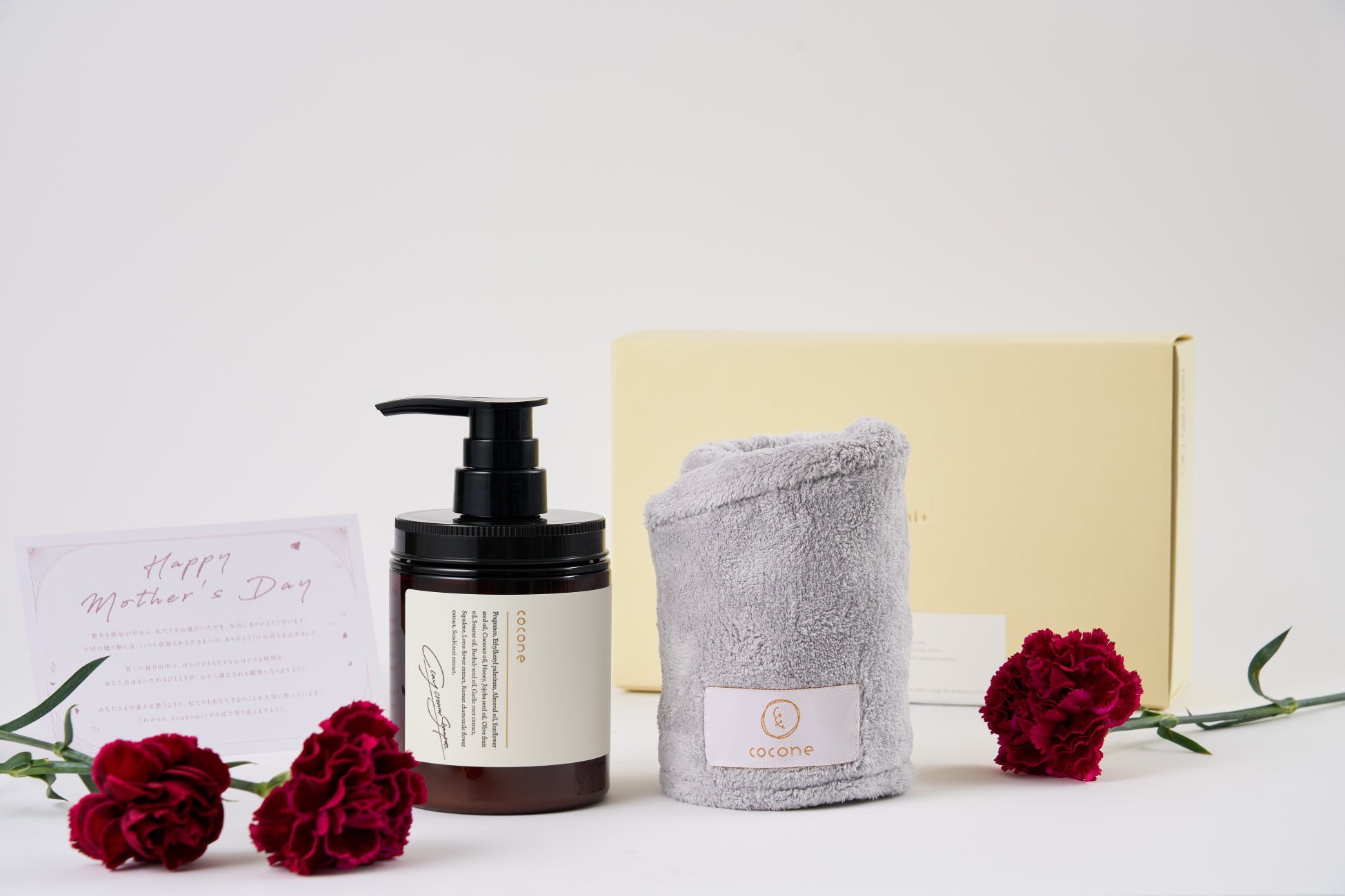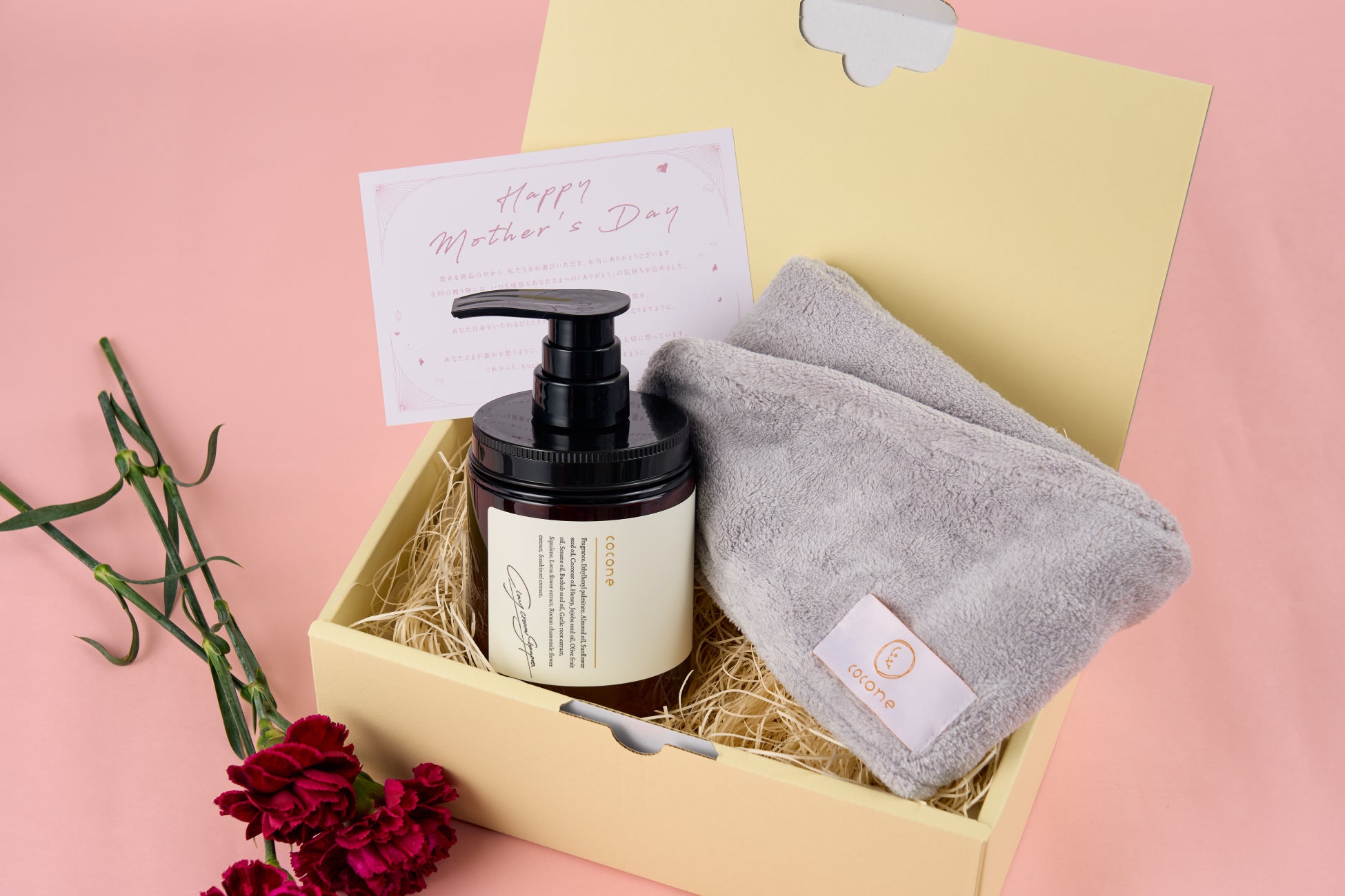 cocone母の日限定ギフトセットは、髪と頭皮をやさしくケアするオールインワンのクリームシャンプーと、髪をすばやく乾かす吸水性タオルの組み合わせ。