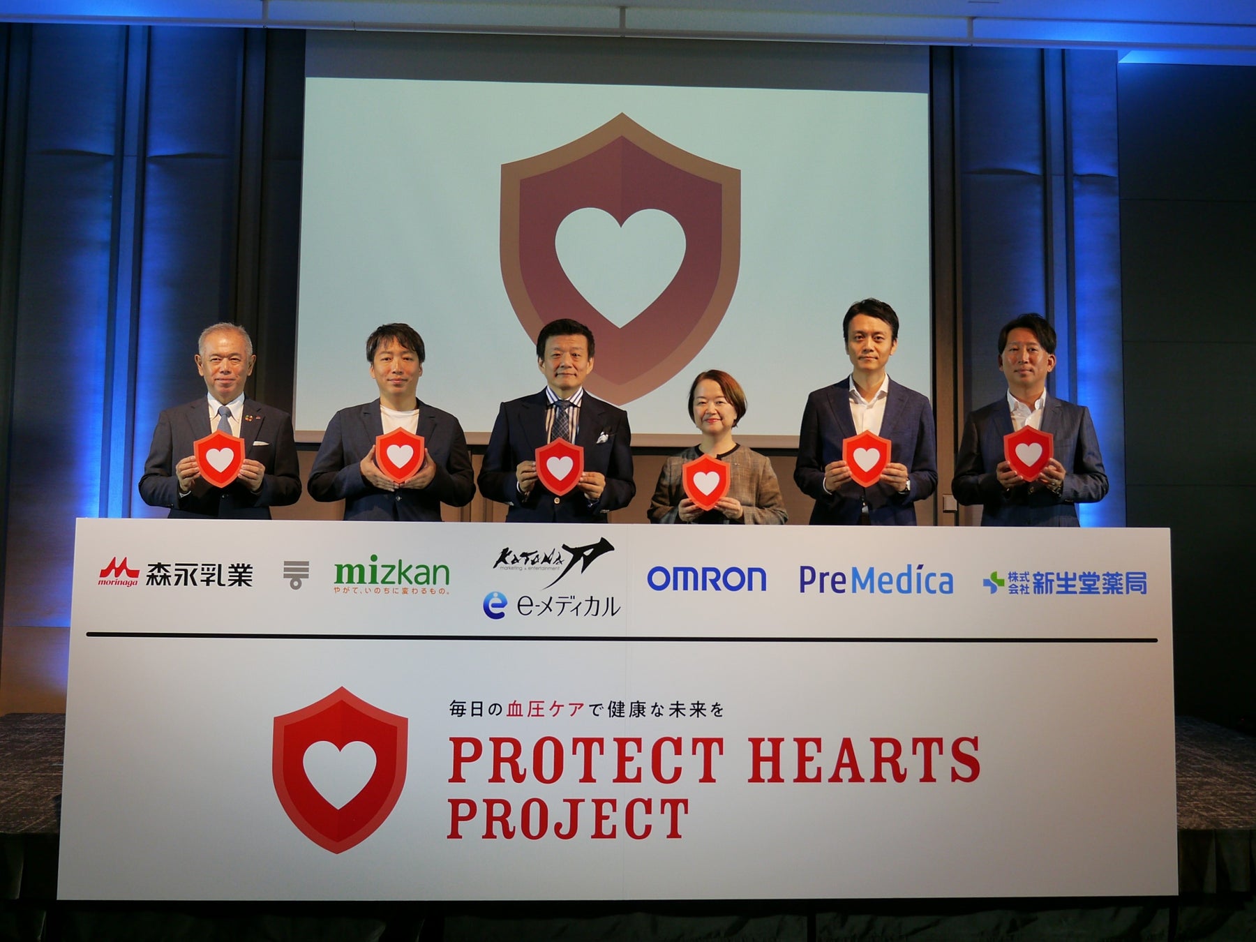 「PROTECT HEARTS PROJECT(読み:プロテクト ハーツ プロジェクト)」は、マーケター・戦略家 森岡毅率いるマーケティング集団「刀」と、お酢や調味料領域でのリーディングカンパニー「ミツカン」を中心に、これまで「血圧」という同じ課題に向き合いながら、個々に取り組んできた各社が「事業を通じた社会課題の解決」で連携する取り組みとして開始しました。食や健康習慣を通して「高めの血圧」に向き合う企業群(TEAM HEALTH:ミツカン、森永乳業) と、疾患のリスク発見~治療に取り組む企業群(TEAM MEDICAL:刀・イーメディカル、オムロンヘルスケア・プリメディカ・新生堂薬局) の計6社からスタートした取り組みは、各企業での新しいサービス展開に加え、発足1年足らずで参画企業が一気に増加し、運動領域にも拡大しました。