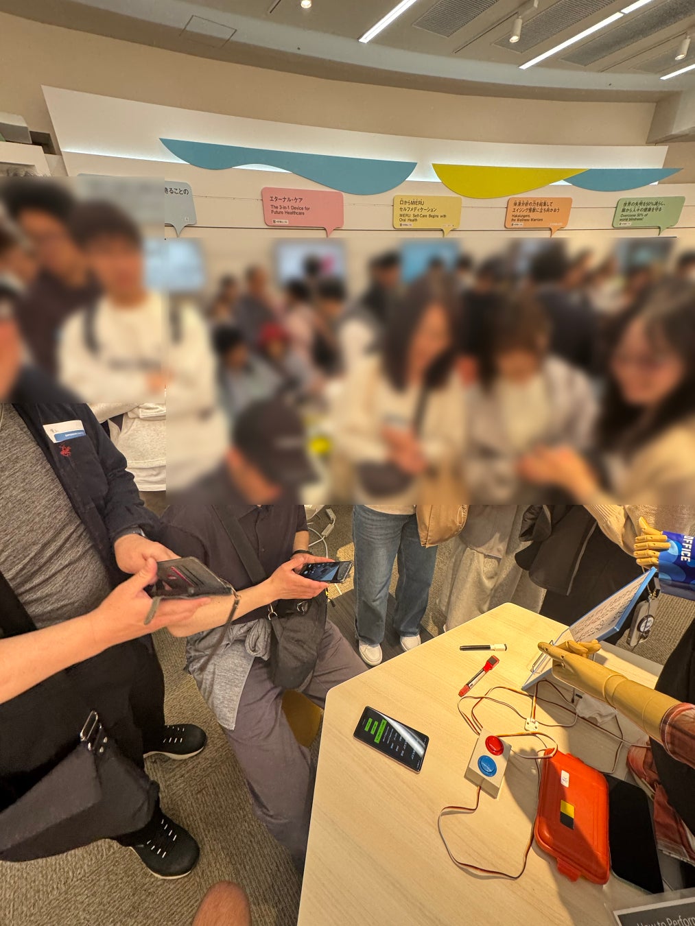 マッスルブループリンツ株式会社(英語表記 Muscle Blueprints, Inc.,本社:東京都渋谷区,代表:衣笠竜太)は、2025年国際博覧会(大阪・関西万博)の「大阪ヘルスケアパビリオン」にて、筋電センサ『筋肉Phone』の体験展示を行いました。「筋肉の質」スコア(=筋質スコア)をわずか1分で可視化できる独自技術により、7日間で1,700名超が体験、最大40分待ちの行列ができるほどの注目を集めました。