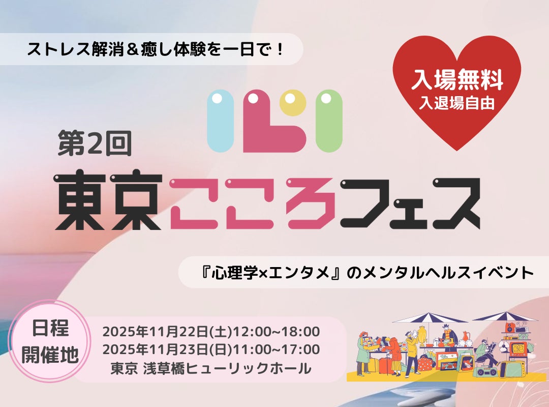 2025年11月22日(土)・23日(日)の2日間、東京・浅草橋ヒューリックホール&カンファレンスにて、メンタルヘルスをテーマとした総合イベント【東京こころフェス】が開催決定!