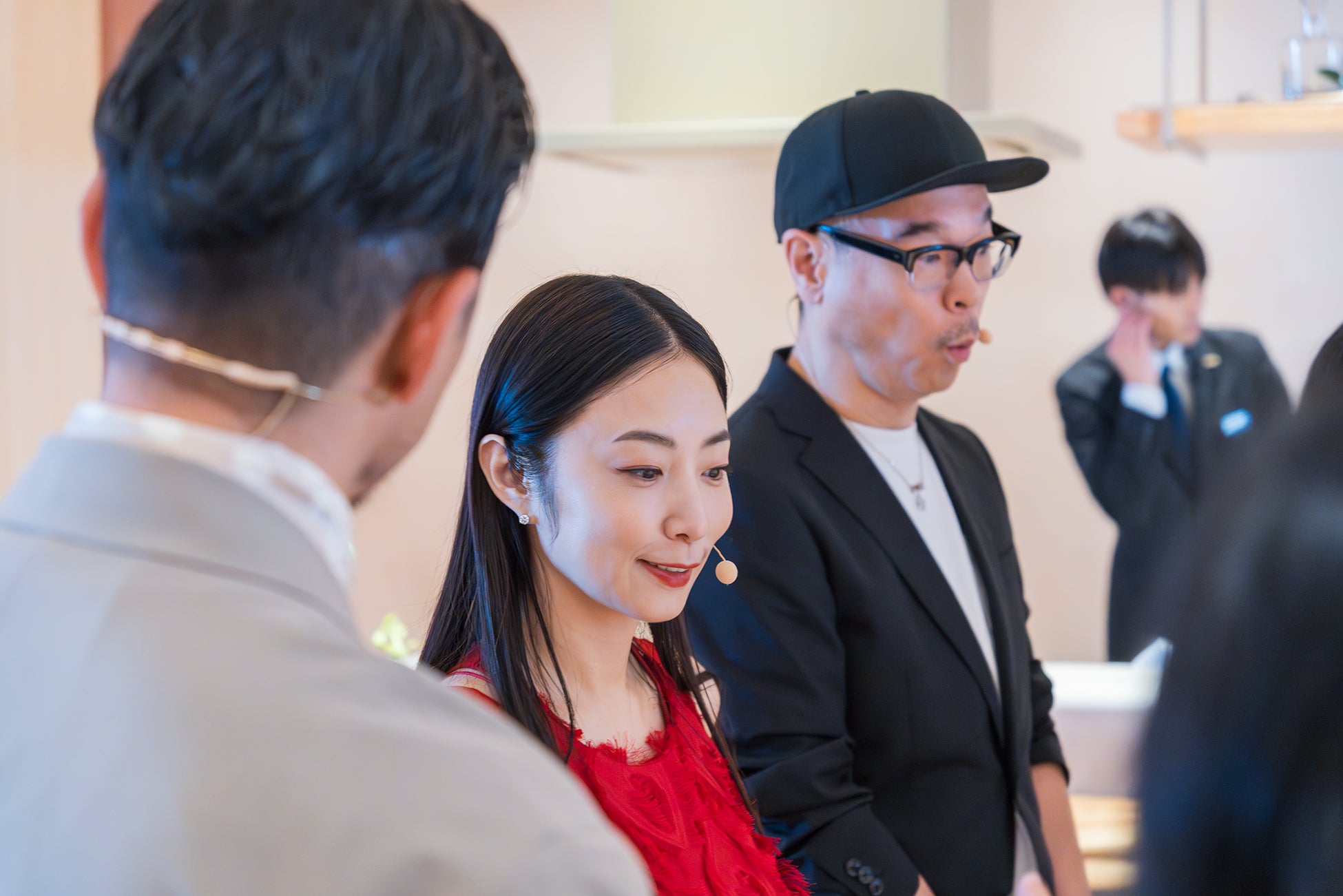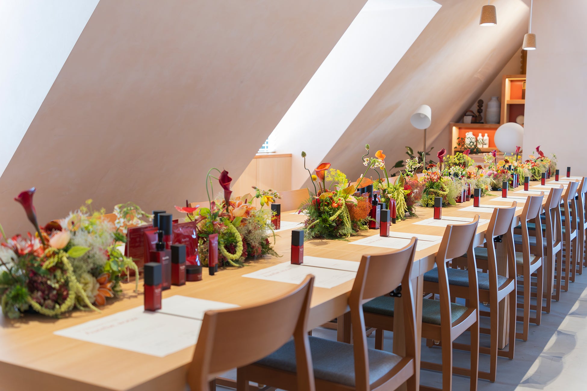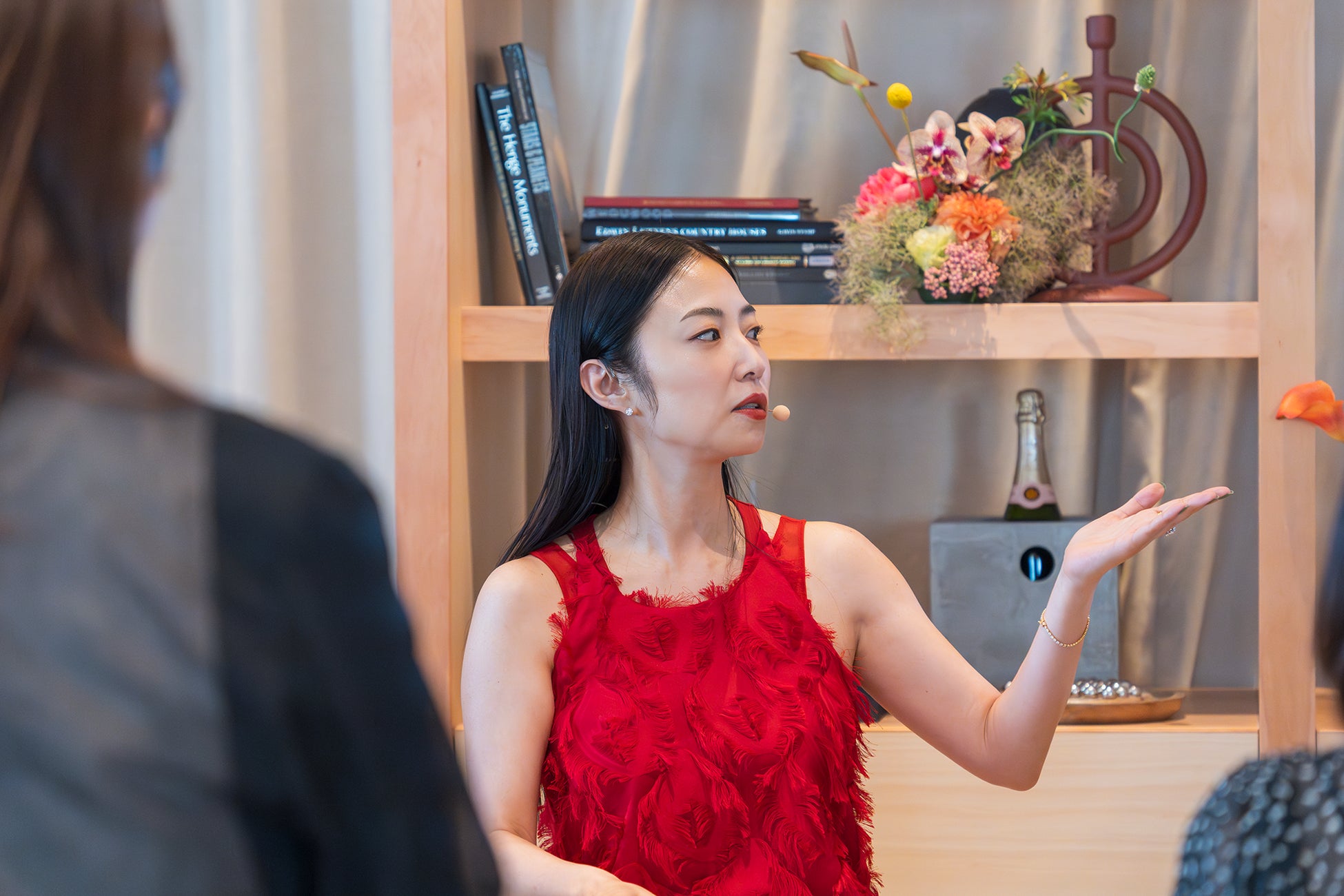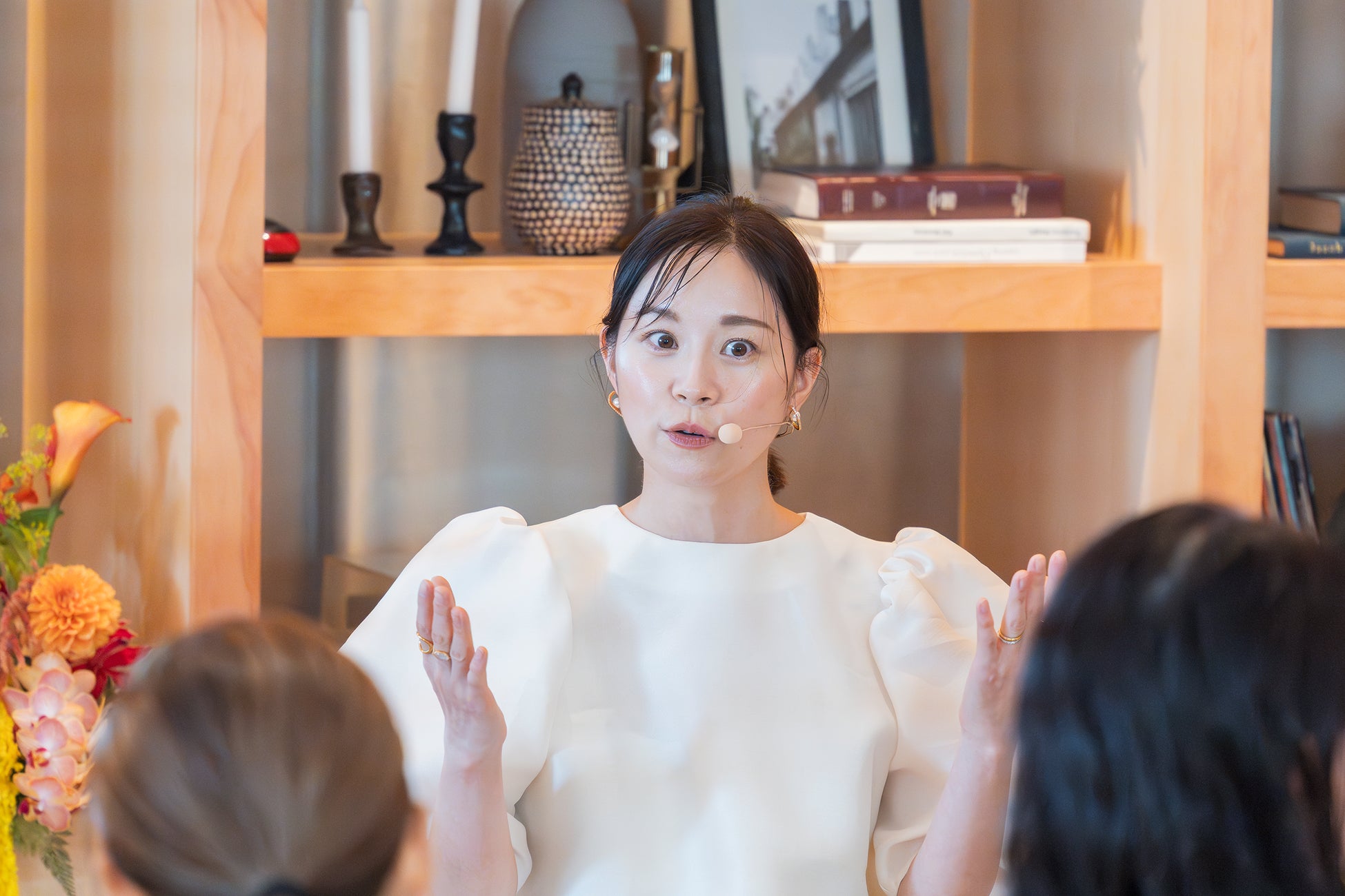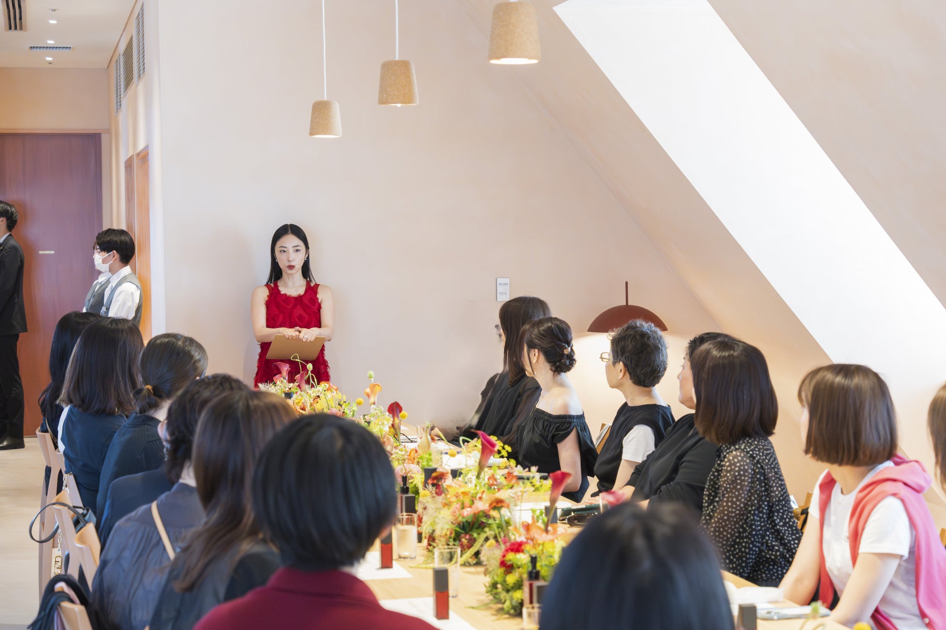 美しい花々に囲まれた「Aurelie. ROOM(オレリー ルーム)」は、MEGUMIのプライベートな場所に招かれたようなリラックス感があり、そして『Aurelie.(オレリー)』の世界観をたっぷり感じていただける心地よい空間が完成しました。そして、美肌が際立つAurelie.レッドの衣装を身にまとって登場したMEGUMIは、自身の体験を交えながら、『Aurelie.(オレリー)』への想いをゲストの皆さまにたっぷりとお伝えしました。