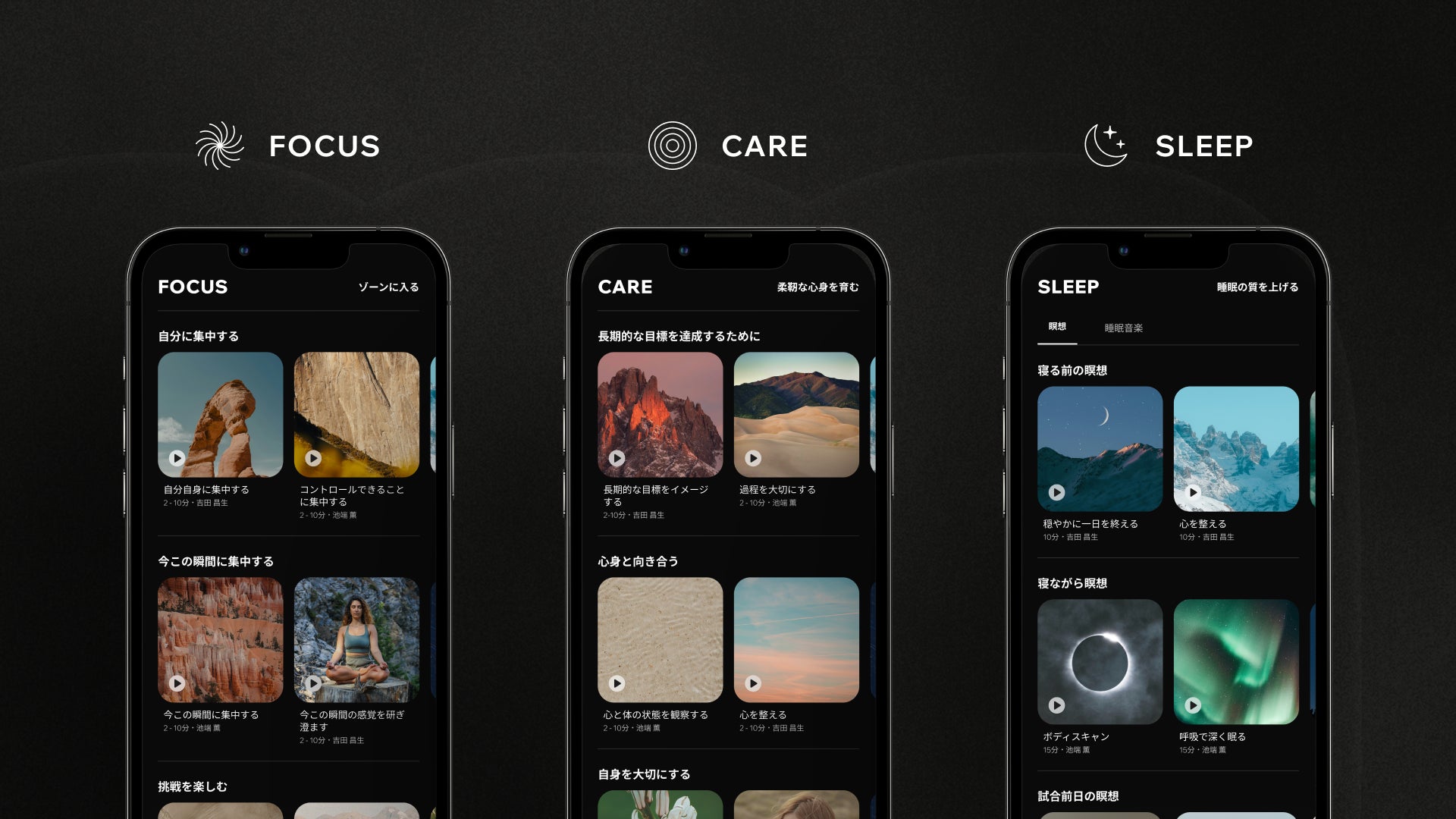 本サービスは、競技パフォーマンス向上のための3つのマインドフルネスプログラム(FOCUS・CARE・SLEEP)を提供。アスリートの方が、マインドフルネスの継続的な実践を通して、集中力・感情調整力・睡眠の質を高めて、プレッシャーのかかる局面でも最大限の力を発揮できるよう開発をしました。