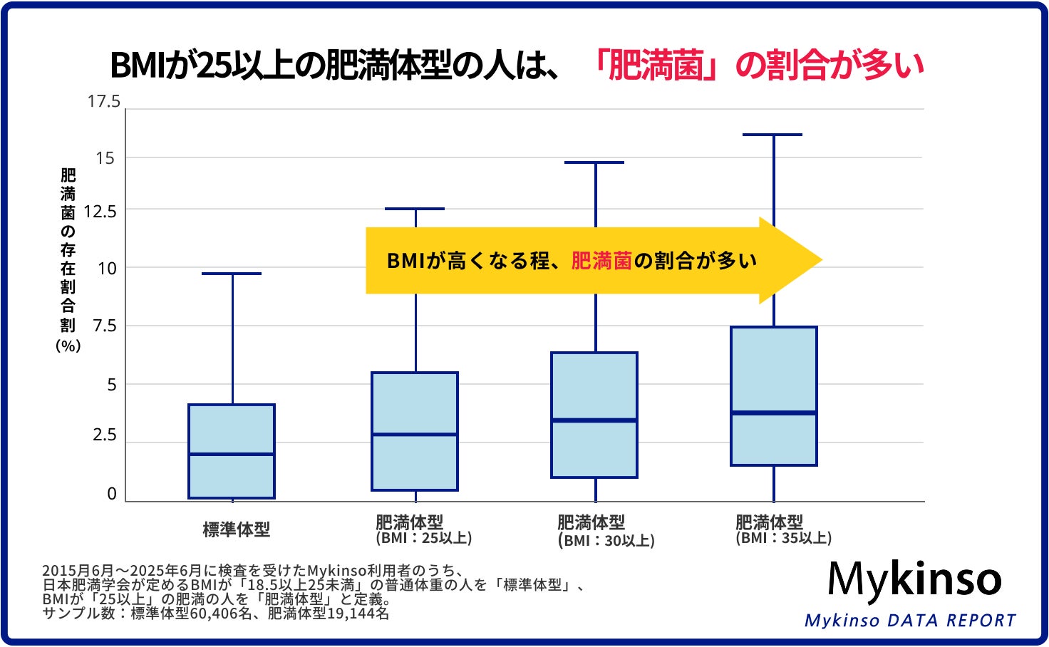 ・分析対象:2015年6月~2025年6月の期間に検査を受けたMykinso利用者のうち、日本肥満学会が定めるBMIが「18.5以上 25未満」の普通体重の人を「標準体型」、BMIが「25以上」の肥満の人を「肥満体型」と定義。