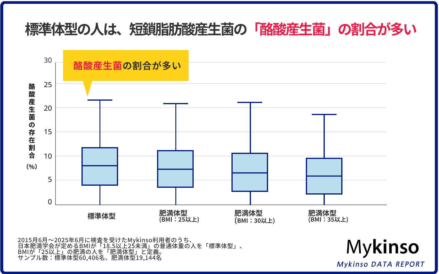 マイキンソーデータより、「標準体型」と「肥満体型」をそれぞれ定義し、「酪酸産生菌(らくさんさんせいきん)」などの「短鎖脂肪酸産生菌」の割合に違いがあるかを確認した結果、標準体型の人は肥満体型の人に比べて、短鎖脂肪酸産生菌の割合が多いことが明らかになりました。
