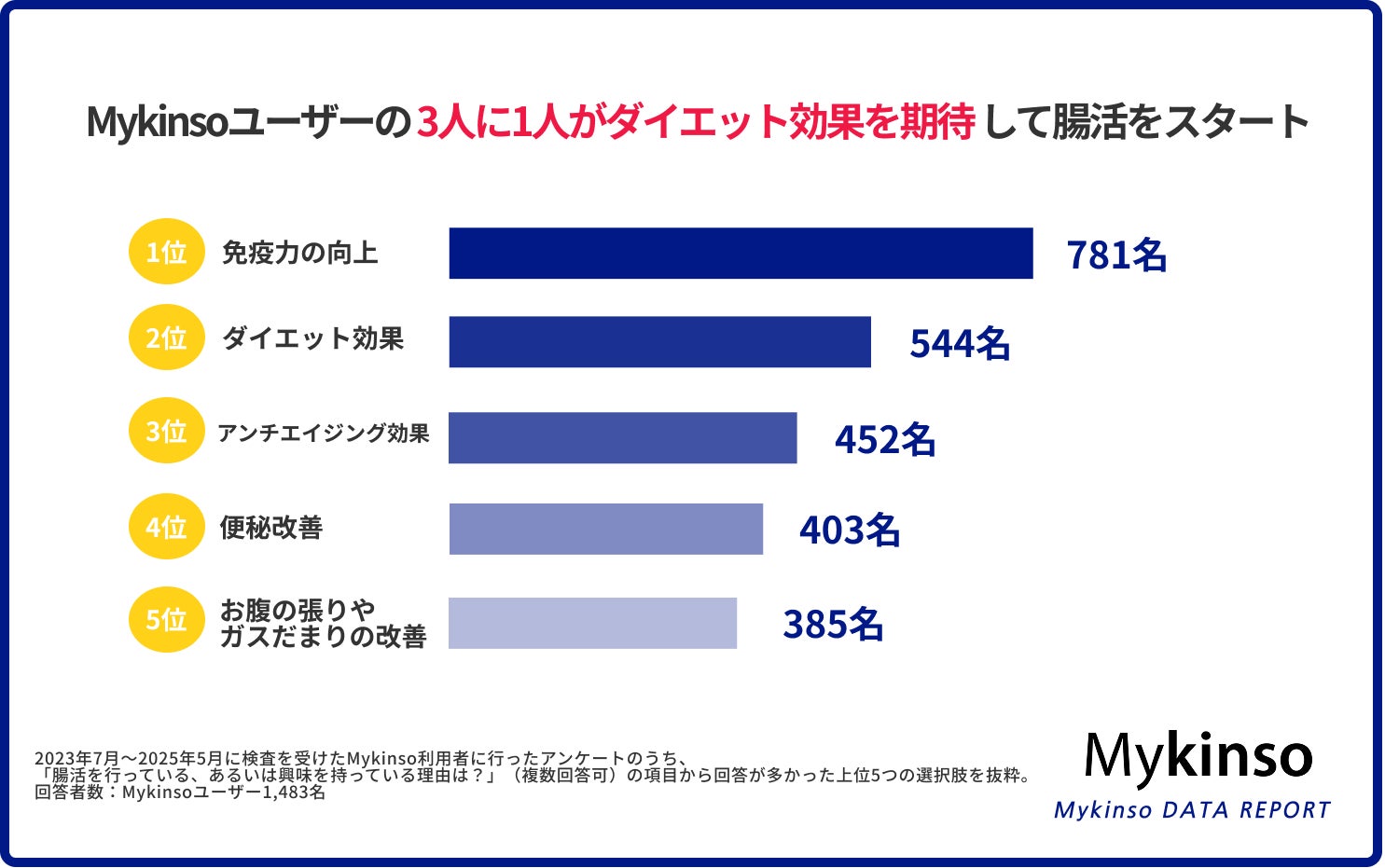 本格的な夏が目前の時期。薄着になり、海やプールでレジャーを楽しむ機会も増えるなど、ダイエットへの関心がより一層高まる季節です。今年、ダイエットへの新たなアプローチとして注目を集めているのが「腸活」です。本リリースでは、腸内環境がダイエットとどのような関係があるのか、累計18万件のマイキンソーデータを元に分析しました。