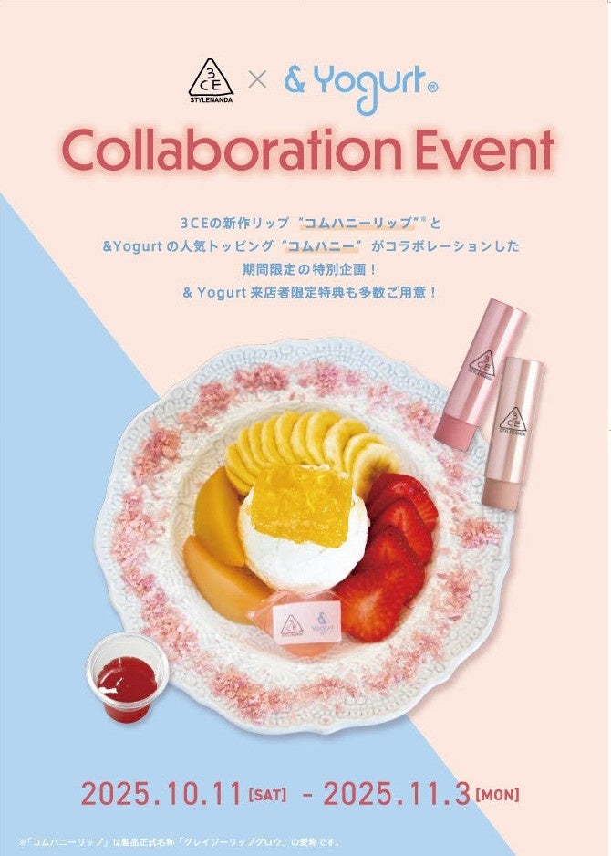 本品は、まるで「#コムハニーリップ」のような仕上がりで、韓国オリーブヤング メイクアップカテゴリーで1位を獲得※した待望のリップ&チークです。本品の発売を記念し、メディアにも数多く取り上げられ、コムハニーのトッピングが特徴の大人気オーガニックグリークヨーグルト専門店「&Yogurt(アンドヨーグルト)」とコラボレーションをし、特別に共同開発したメニューを2025年10月11日(土)~11月3日(月)の期間限定で販売いたします。さらに、&Yogurtご来店のお客様には豪華特典もご用意しております。