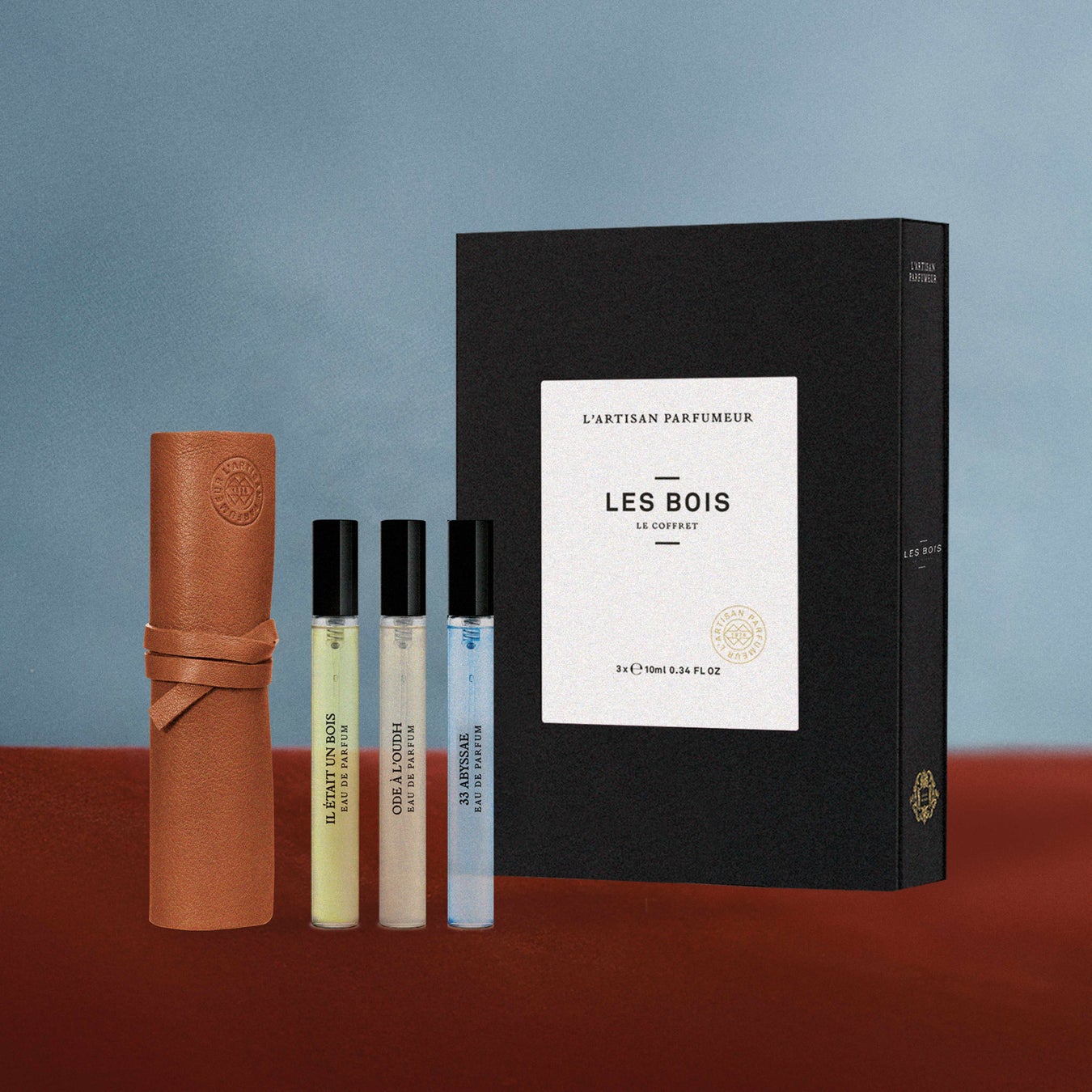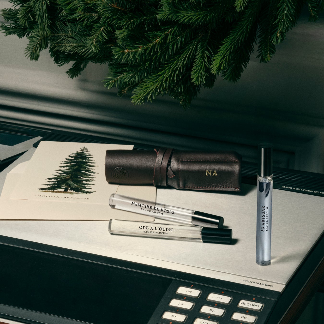 手仕事によるレザーポーチに、10mlトラベルサイズからお好きな香り3種類を選べるセット