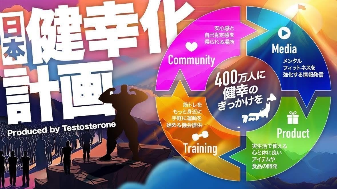 Testosterone氏が人生を賭けて推進する、全国民の「健幸」実現を目指す社会プロジェクトです。「健幸」とは、病気でない状態にとどまらず、自分を好きになり、笑顔で日々を過ごせ、支え合える仲間がいる幸福な状態を指します。